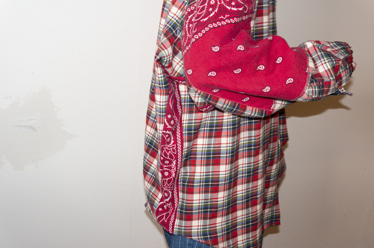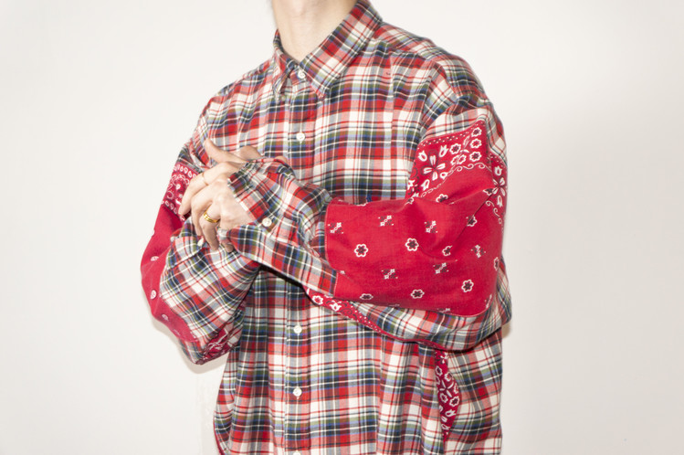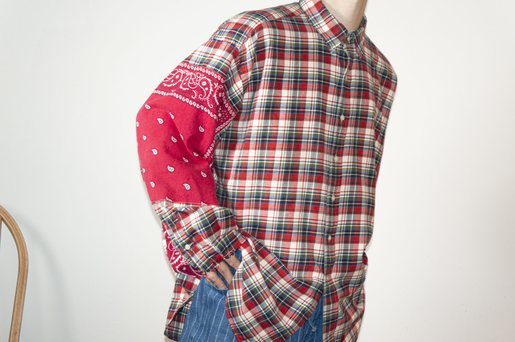 레드 색상 레트로한 체크 패턴이 인상적인 부드러운 면 원단의 셔츠에 Fast color의 반다나들을 이용하여 양쪽 소매에 넓게 패치워크하고 옆을 채워 만들어진 구성을 확인할 수 있습니다.