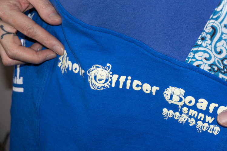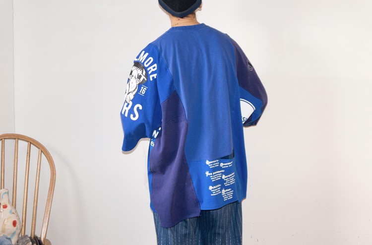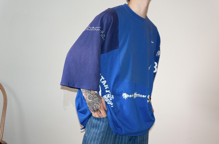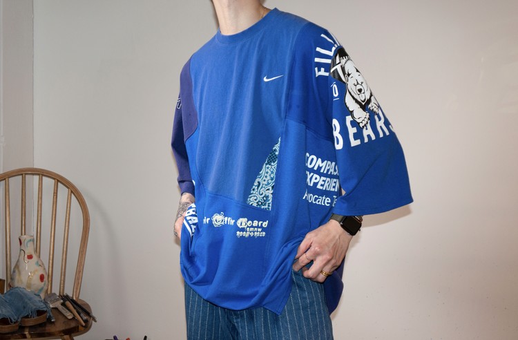 East oklm, The hand remake garments로 여러장의 티셔츠들을 해체하고 재구성하여 만들어진 믹스 티셔츠 상품. 빈티지한 블루 색상의 나이키 티셔츠, 그리고 다양한 아메리칸 빈티지 티셔츠들과 적당한 Color fade가 인상적인 네이비 색상의 Champion 티셔츠의 조각들을 연결하여 구성 되었습니다.