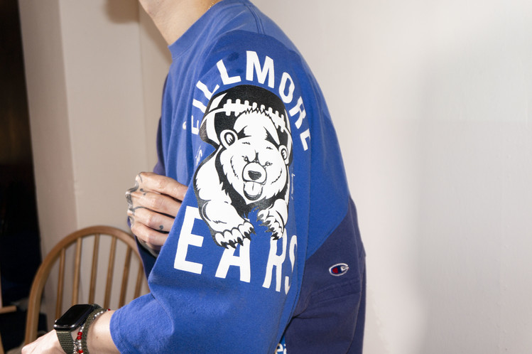 앞판에는 Fast color의 반다나를 패치워크한 부분과 뒤판에는 Champion 로고 자수, 플란넬 셔츠의 조각을 패치워크한 포인트를 볼 수 있으며, 전체적으로 조화로운 프린팅의 조합으로 좋은 균형감을 확인할 수 있습니다.