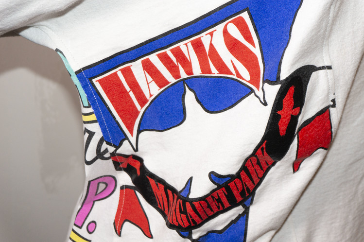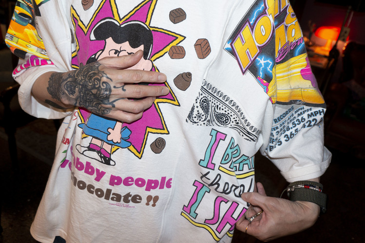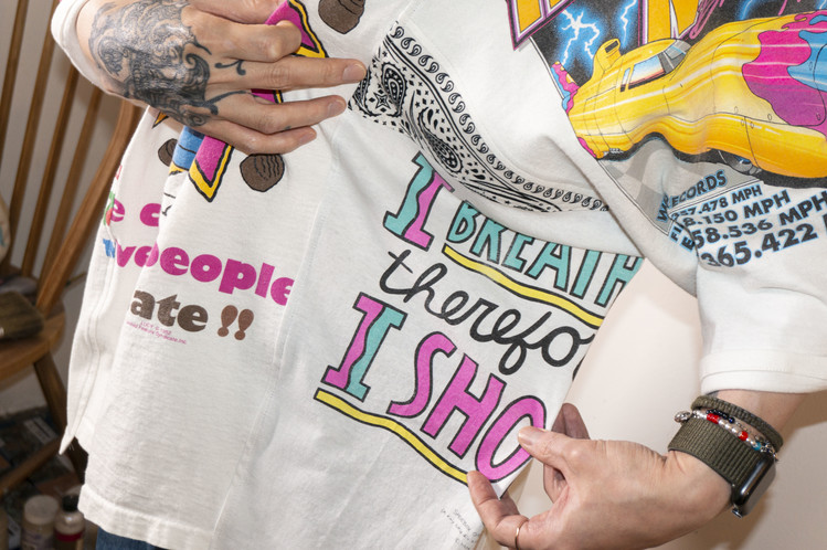 East oklm, The hand remake garments로 여러장의 티셔츠들을 해체하고 재구성하여 만들어진 믹스 티셔츠 상품.