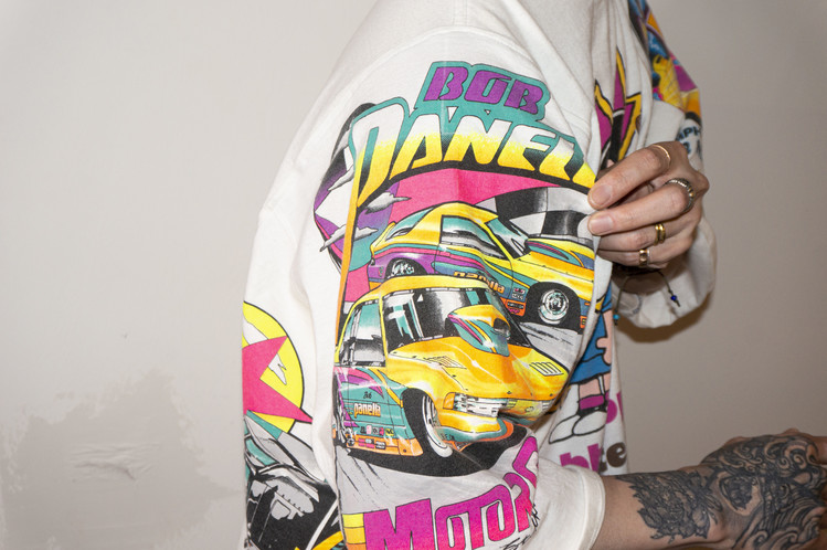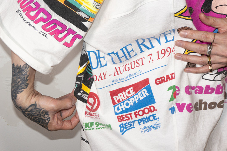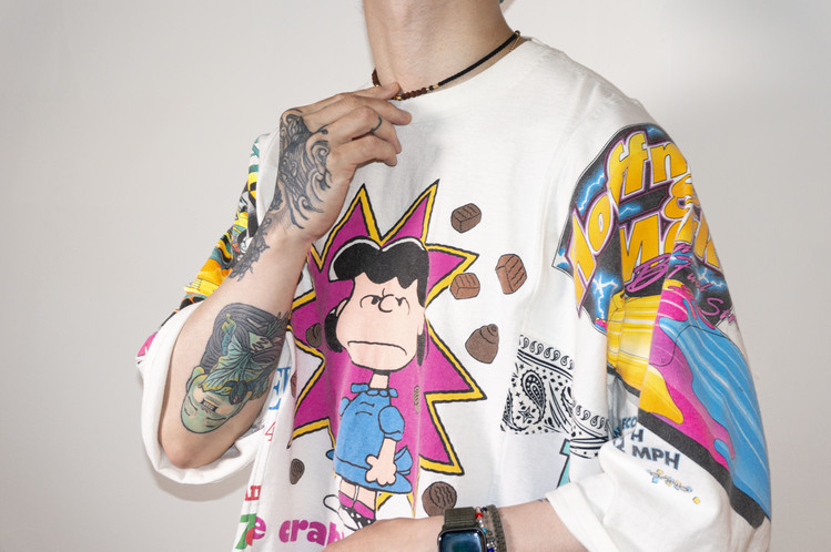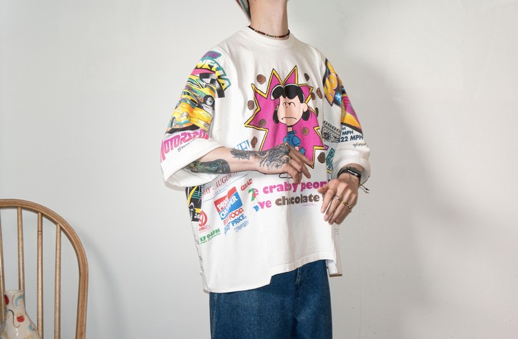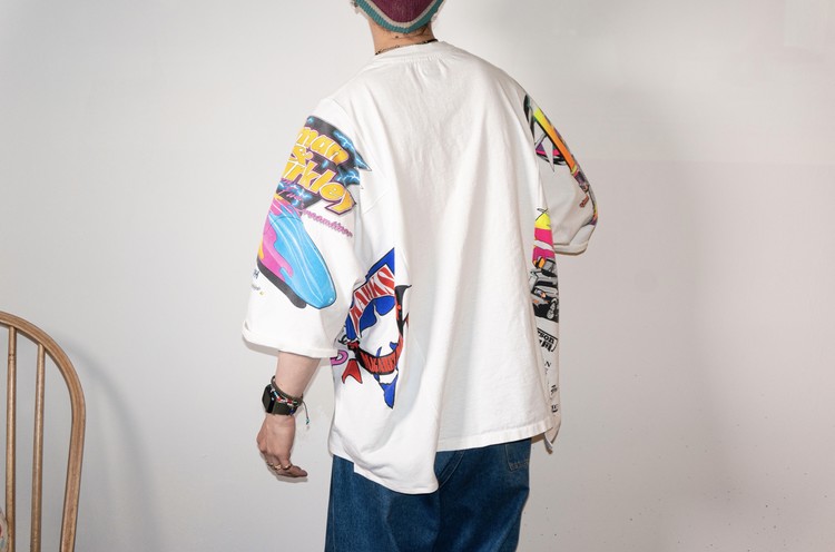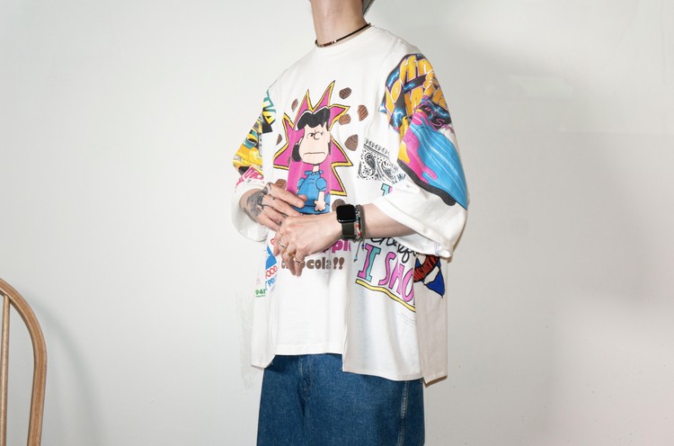 귀여운 캐릭터와 레트로한 핑크톤의 컬러감이 인상적인 프린팅의 티셔츠들을 해체하여 구성 되었으며, Fast color의 빈티지 반다나의 조각을 패치워크한 부분 또한 확인할 수 있습니다.