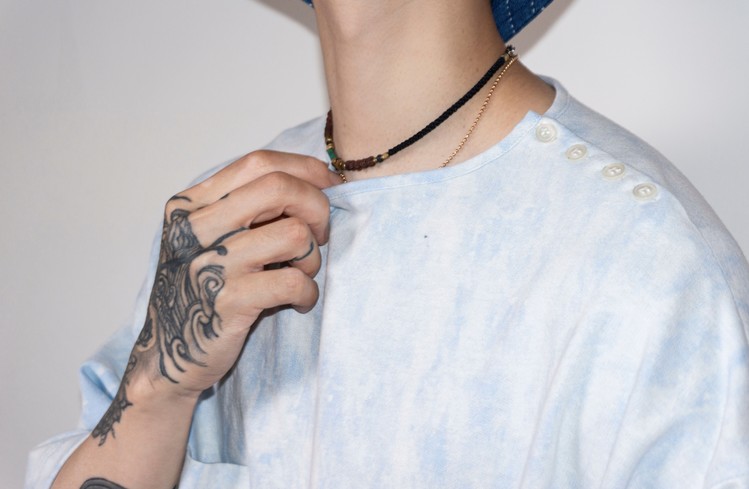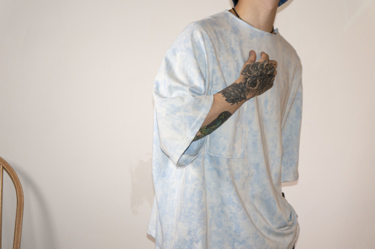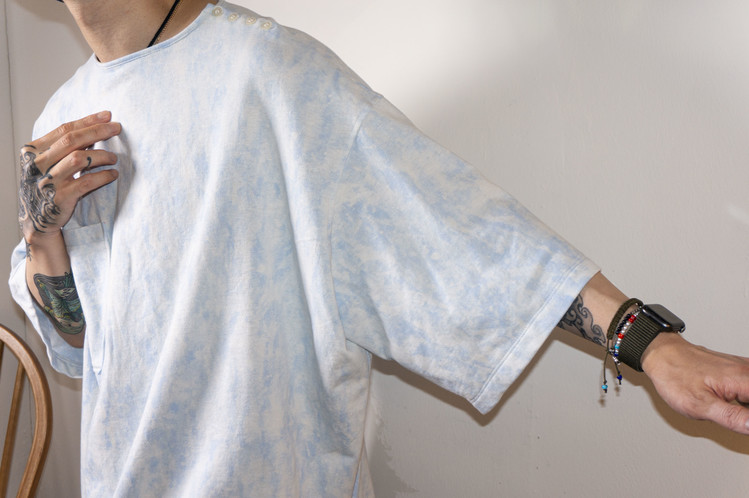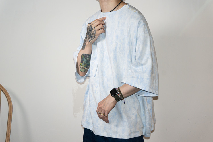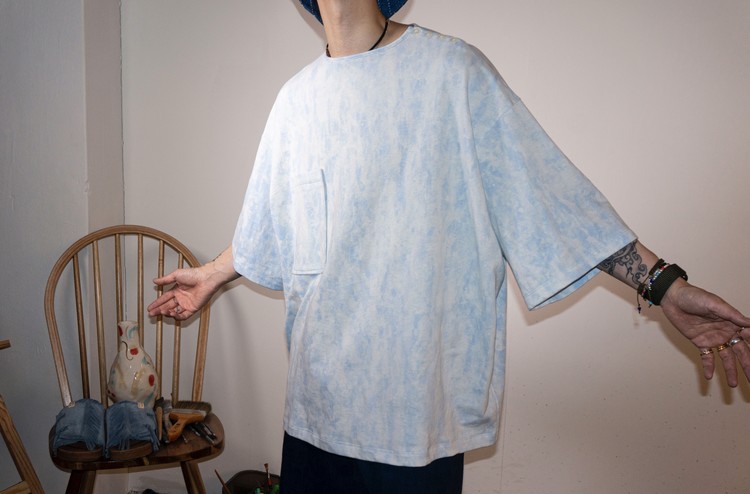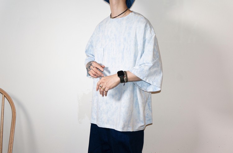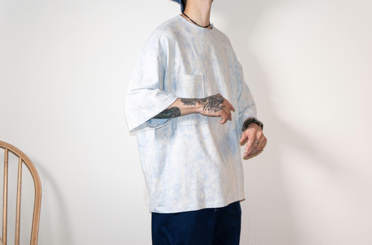 East oklm, collection for summer의 제품으로 맑은 여름 하늘을 연상하게 하는 시원한 느낌의 나염과 여유로운 실루엣으로 East oklm, 여름의 기분을 담은 T-shirt 상품.