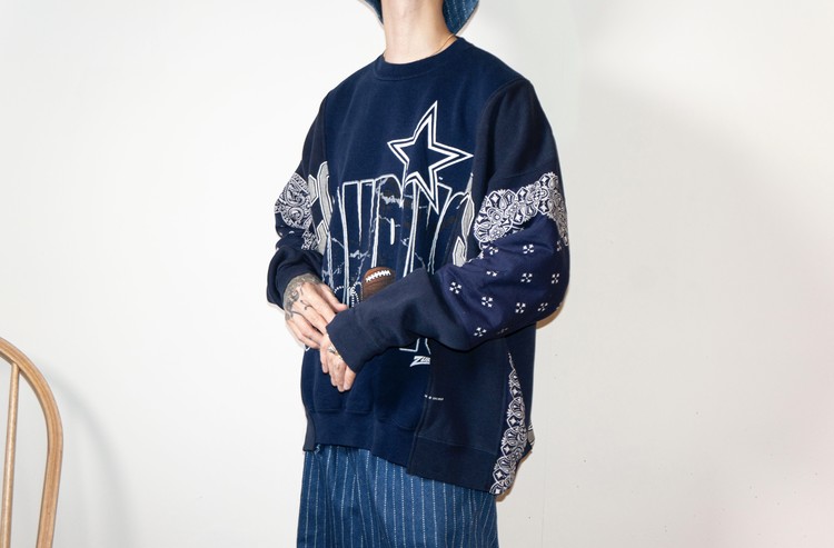 East oklm, The hand remake garments로 아메리칸 빈티지 스웻셔츠들을 해체하고 재구성하여 반다나로 포인트를 만든 상품.