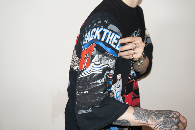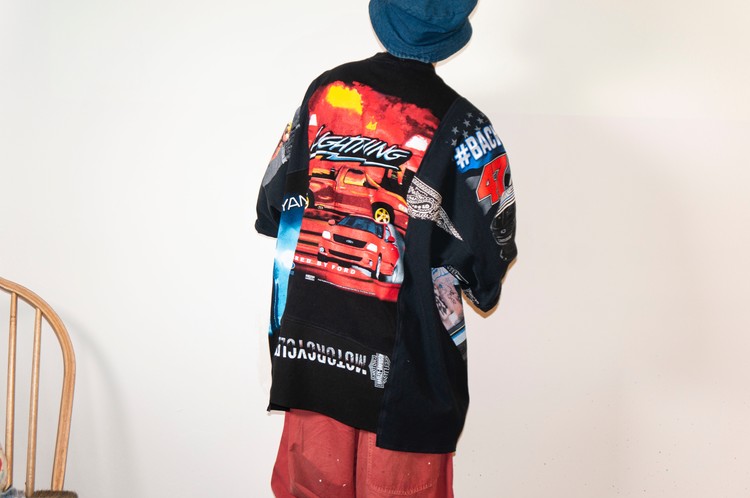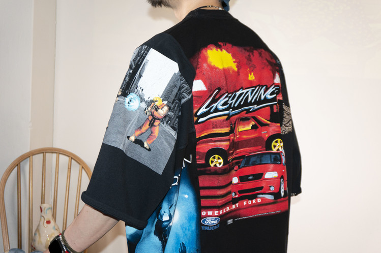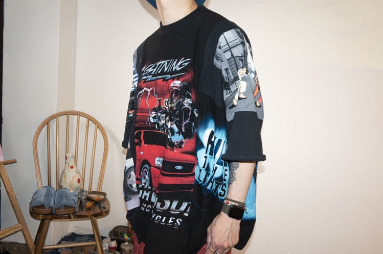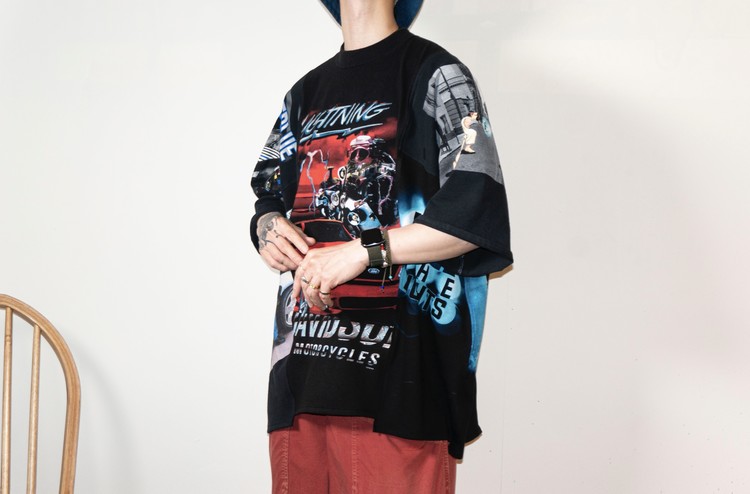 East oklm, The hand remake garments로 여러장의 티셔츠들을 해체하고 재구성하여 만들어진 믹스 티셔츠 상품.