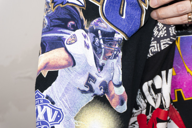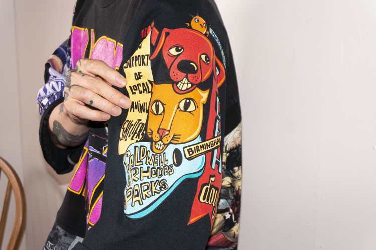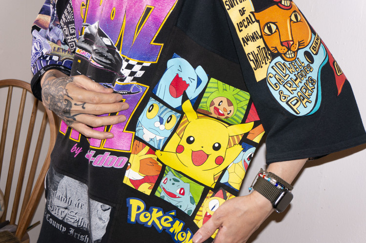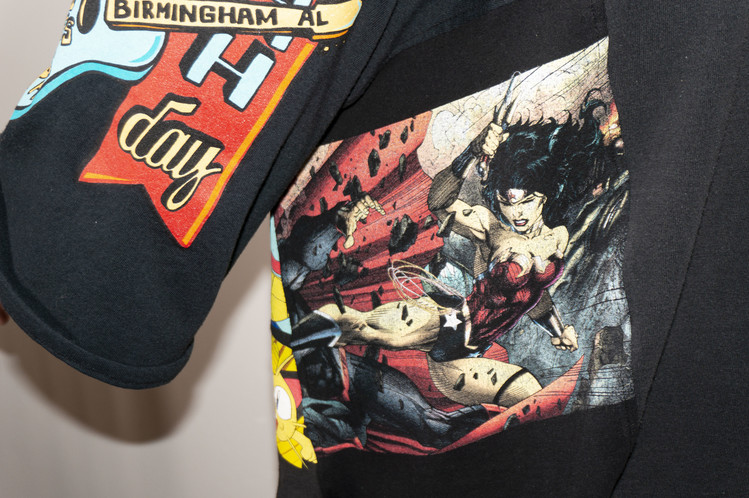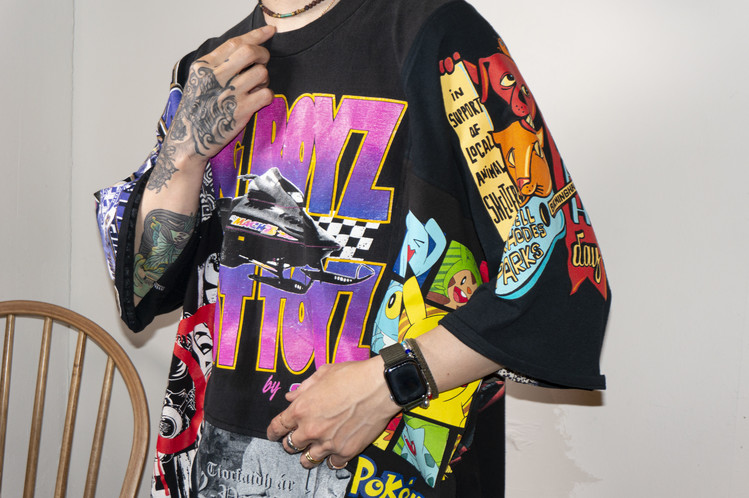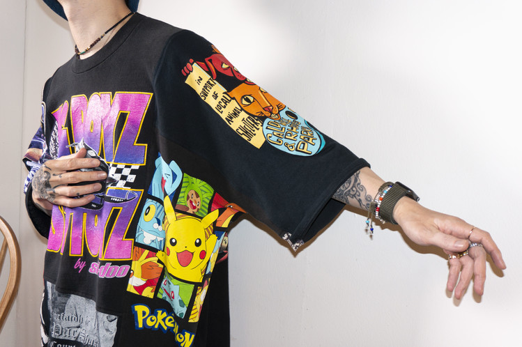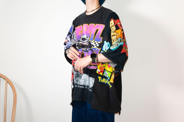 레트로한 프린팅들이 인상적인 티셔츠들의 조각으로 구성되어 다채로운 색상들과 캐릭터 등의 조화를 확인할 수 있습니다.