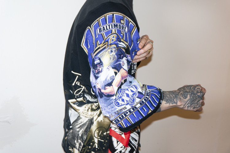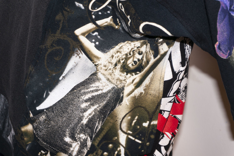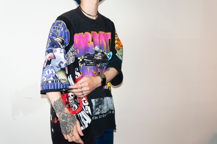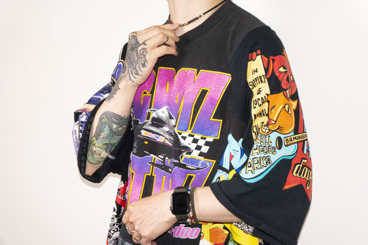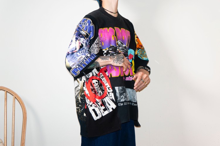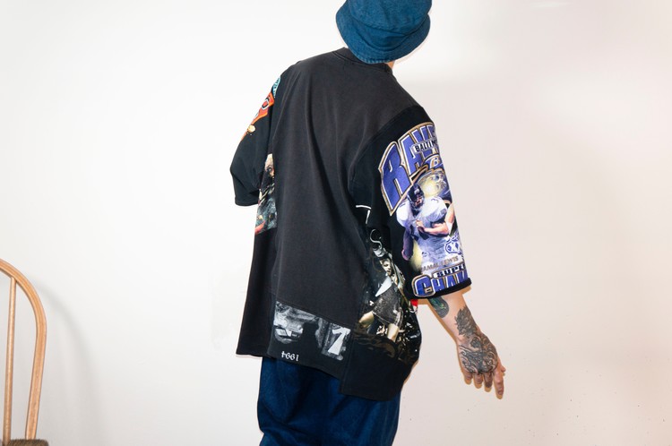 East oklm, The hand remake garments로 여러장의 티셔츠들을 해체하고 재구성하여 만들어진 믹스 티셔츠 상품.
