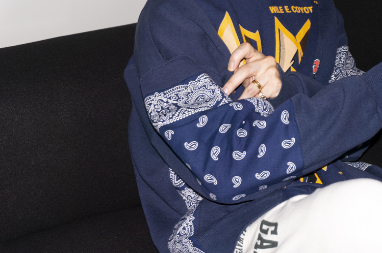 East oklm, The hand remake garments로 아메리칸 빈티지 스웻셔츠들을 해체하고 재구성하여 반다나로 포인트를 만든 상품.