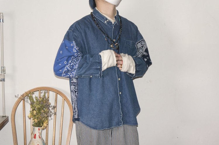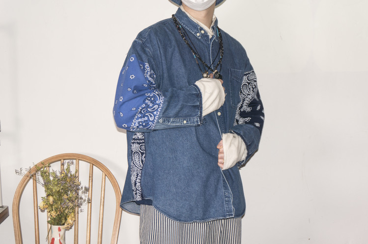 - East oklm, The hand remake denim으로 데님셔츠의 소매에 넓은 반다나를 패치워크하고, 옆을 채운 상품. 블루와 네이비, 그리고 데님의 조화로운 색상의 어울림을 볼 수 있는 셔츠로 넓게 패치워크 된 소매부분의 반다나와 옆에 채워진 반다나의 포인트를 즐길 수 있습니다. 소매와 옆의 반다나는 서로 색상을 다르게 하여 지루하지 않도록 표현되어 있으며, 이는 좋은 밸런스로 볼 수 있는 부분 입니다.
