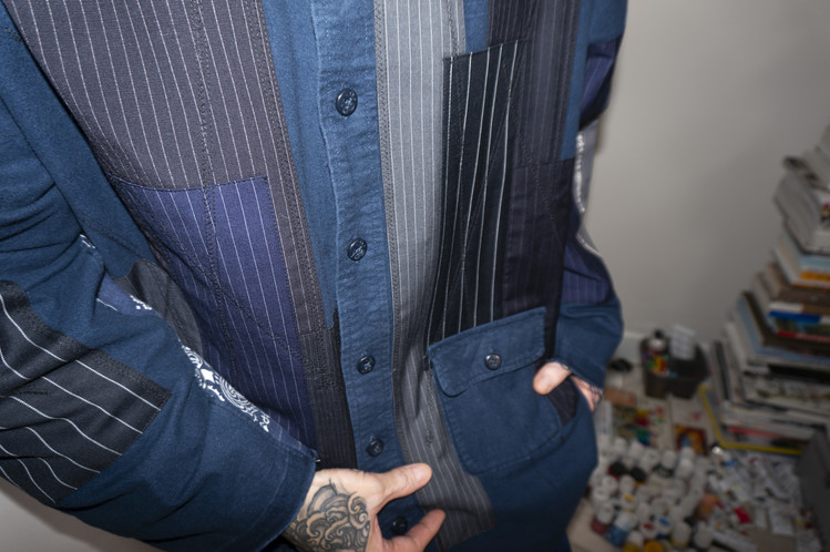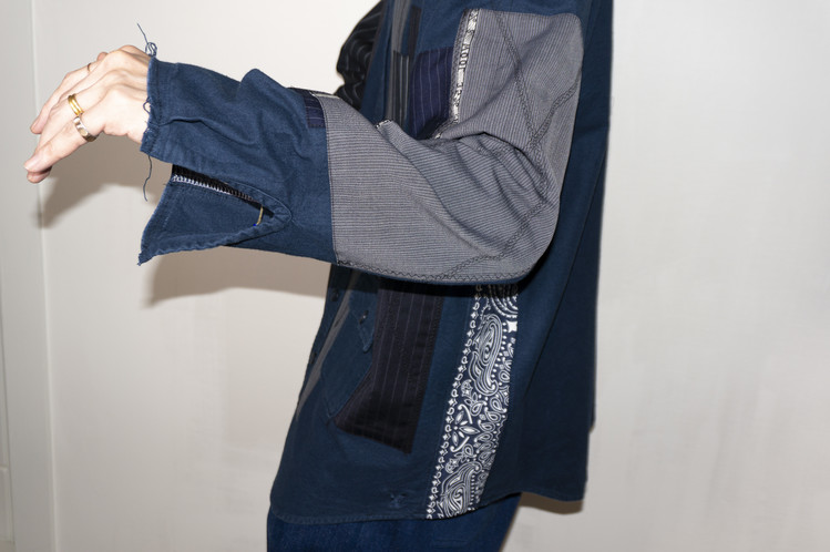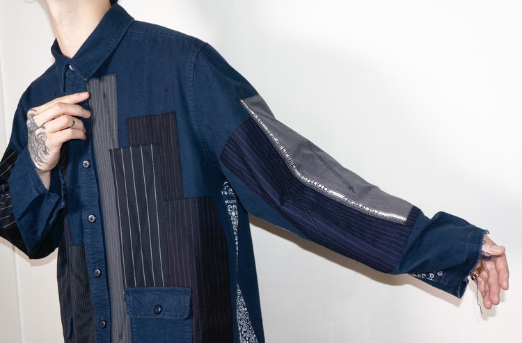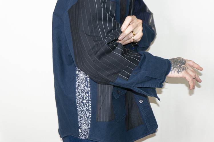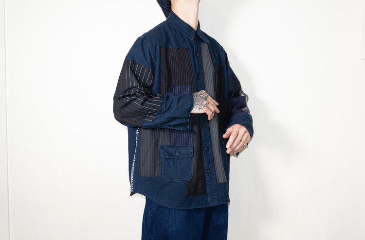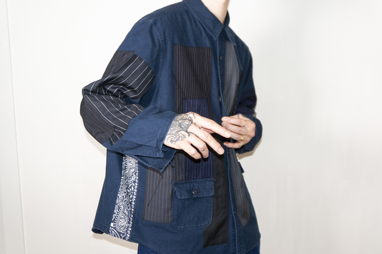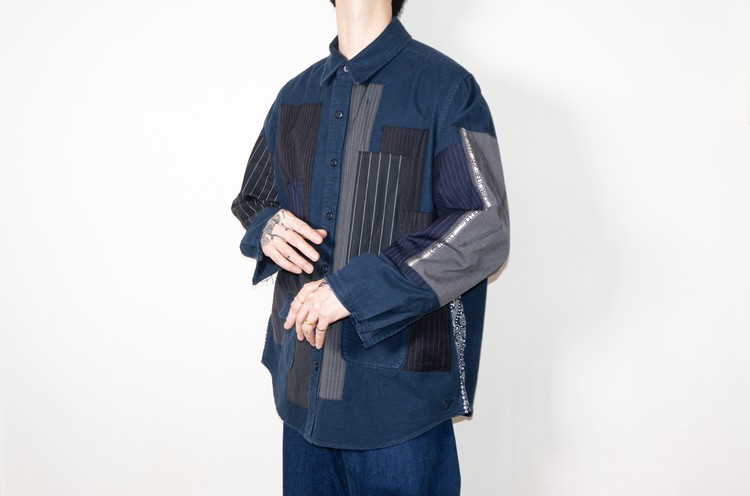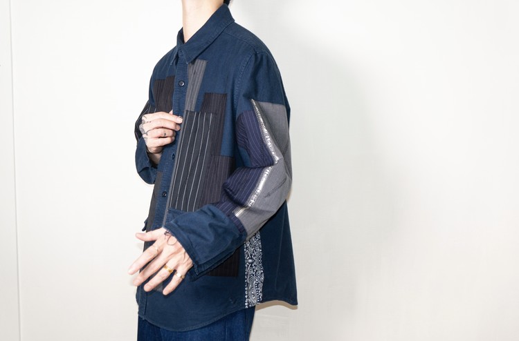 East oklm, The hand remake garments로 어둡고 진한 네이비 색상의 플란넬 셔츠에 테일러 원단을 패치워크하고, 반다나로 옆을 채우는 Landfill 방식으로 만들어진 셔츠 상품.