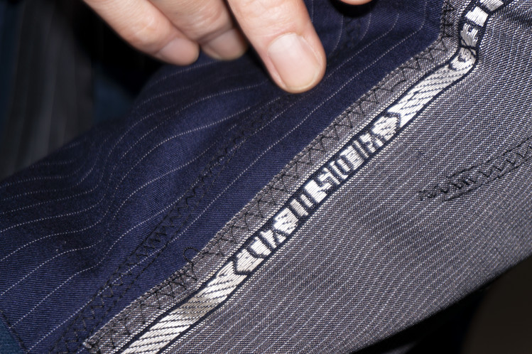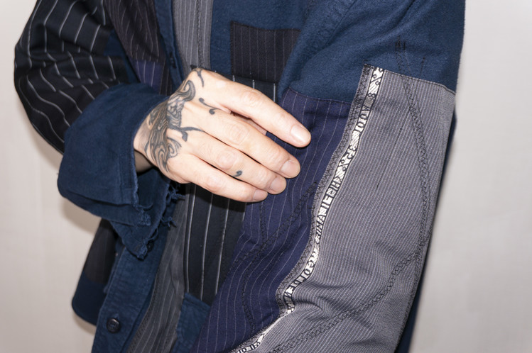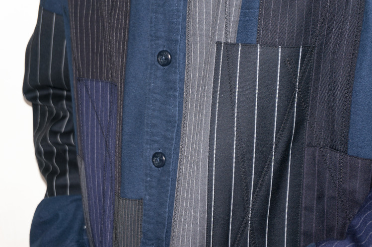 부드럽고 따뜻한 플란넬 소재의 셔츠에 블랙과 그레이 색상의 테일러 원단들을 이용하여 불규칙하지만 정돈된 형태의 조화로운 패치워크를 확인할 수 있으며, 왼쪽 소매에는 테일러 원단의 혼용률과 출처가 나와 있는 리미지 파트를 사용하여 보다 좋은 포인트를 확인 할 수 있습니다.