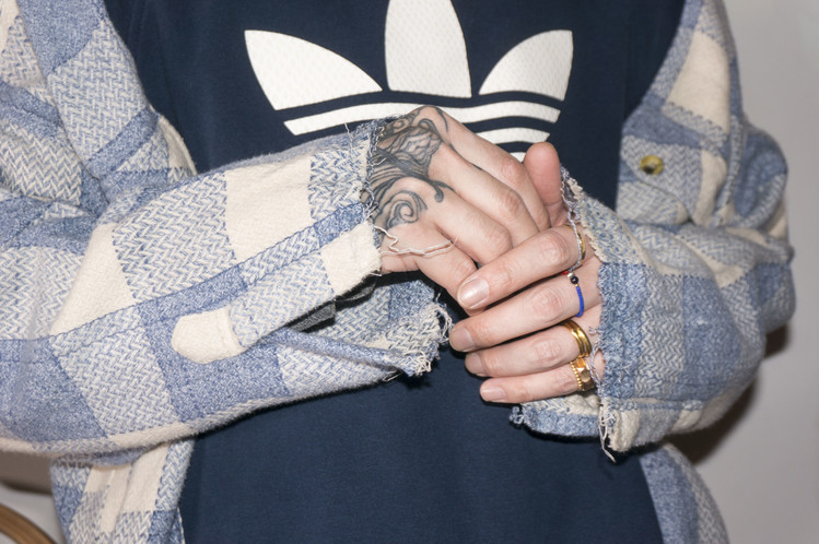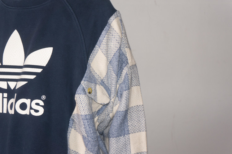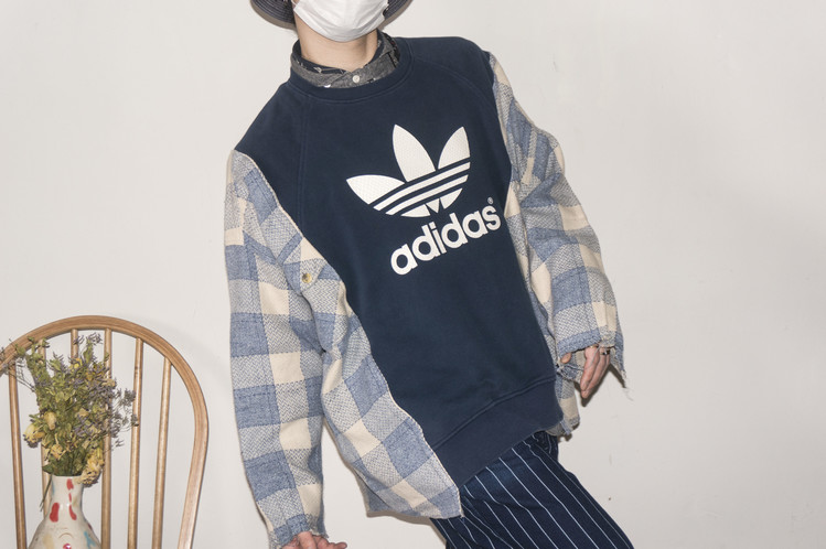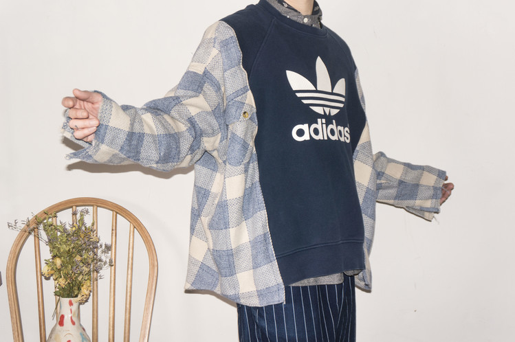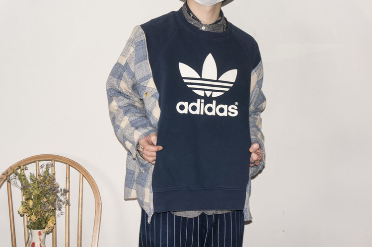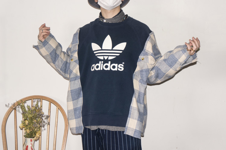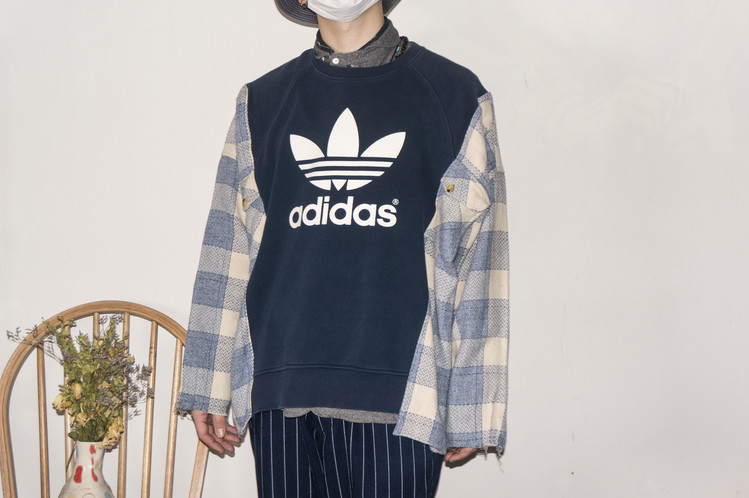 - East oklm, The hand remake garments로 아디다스 스웻셔츠에 플란넬 셔츠를 믹스하여 만든 상품. 아디다스의 세잎로고 중심으로 양옆에 은은한 컬러감의 플란넬 셔츠를 믹스하여 만들었습니다. 네이비와 스카이 블루 계열의 조화이지만, 따뜻함을 느낄 수 있는 느낌으로 표현되었고, 전체적인 느긋한 실루엣은 여유로움을 한껏 품고 있어, 편안한 기분으로 입을 수 있는 하나의 옷이 되었습니다..