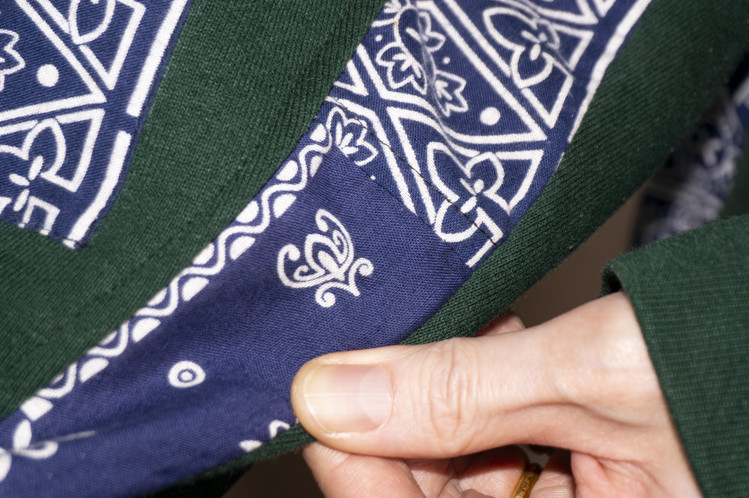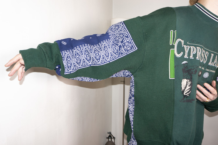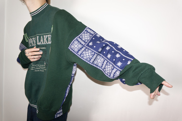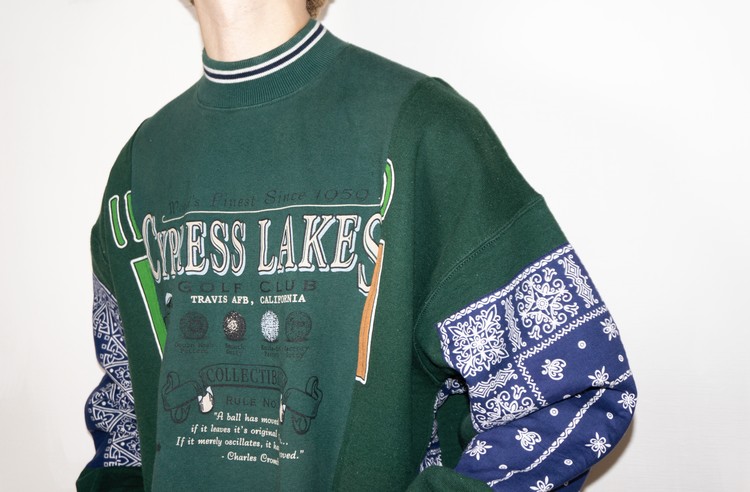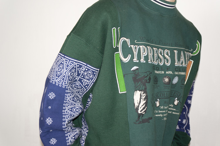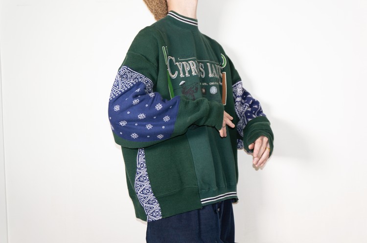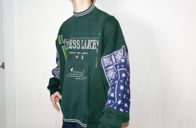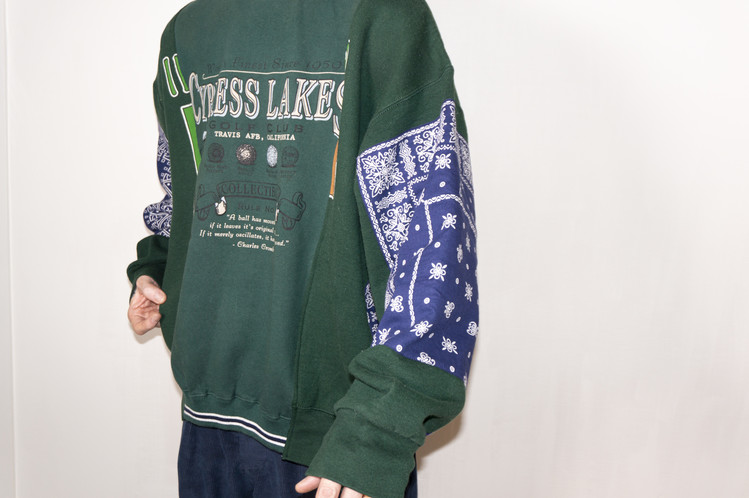 East oklm, The hand remake garments로 아메리칸 빈티지 스웻셔츠들을 해체하고 재구성하여 반다나로 포인트를 만든 상품.
