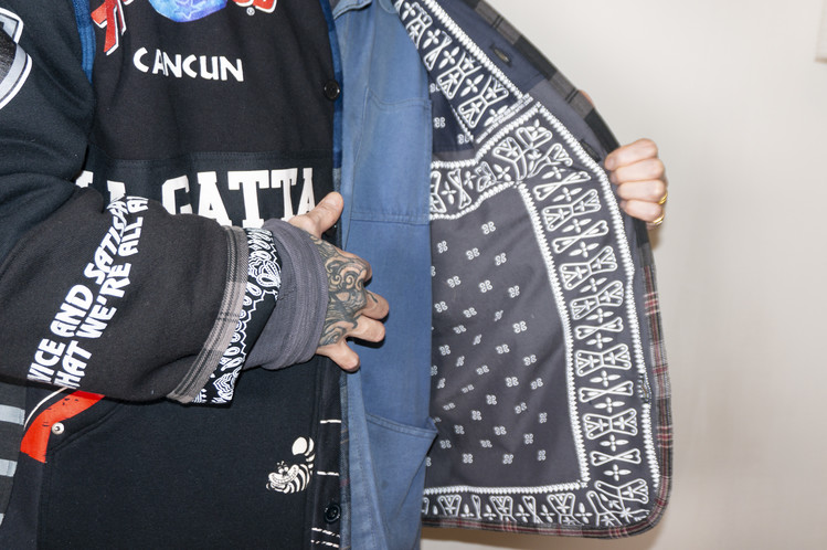 뒤집어 입을 경우 블랙 색상과 탈색한 반다나들로 다양한 문양을 확인할 수 있으며, 조화로운 배치로 좋은 균형감을 확인할 수 있습니다. 마감은 여러 체크 패턴과 색상의 플란넬 조각들로 이루어져 좋은 포인트로 높은 완성도를 보여 줍니다.