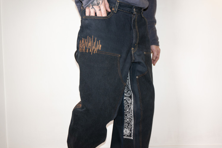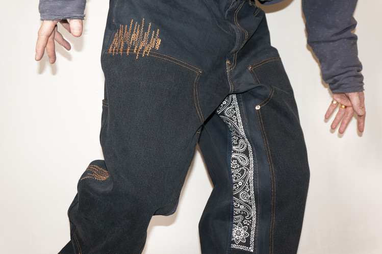 팬츠의 안심 또한 Levis 512 데님 팬츠의 뒷면과 앞면을 연결하고, Fast color의 빈티지 반다나 조각의 패치워크로 채워 졌으며, 곳곳에 위치한 지그재그 스티치를 볼 수 있습니다.