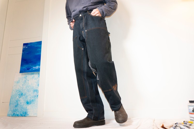 East oklm, The hand remake denim으로 Levis 데님 팬츠들을 해체하고 재구성하여 만들어진 리메이크 더블니 워크 팬츠 상품.