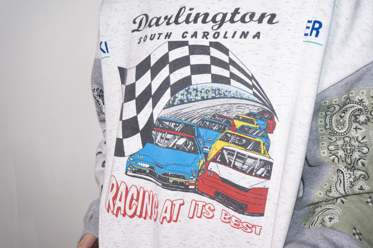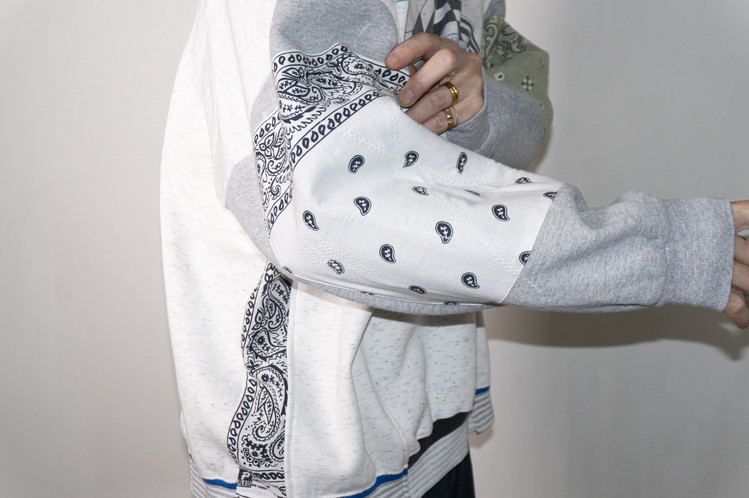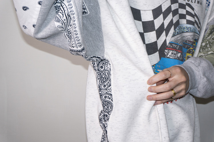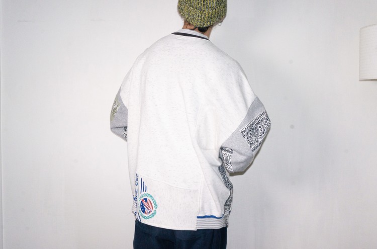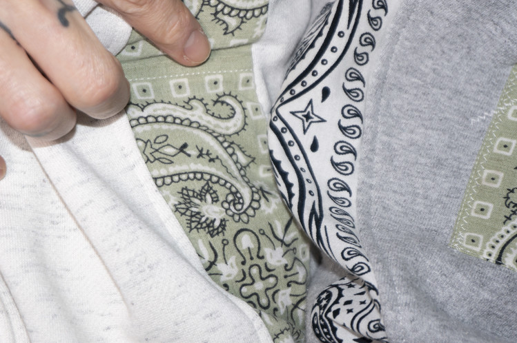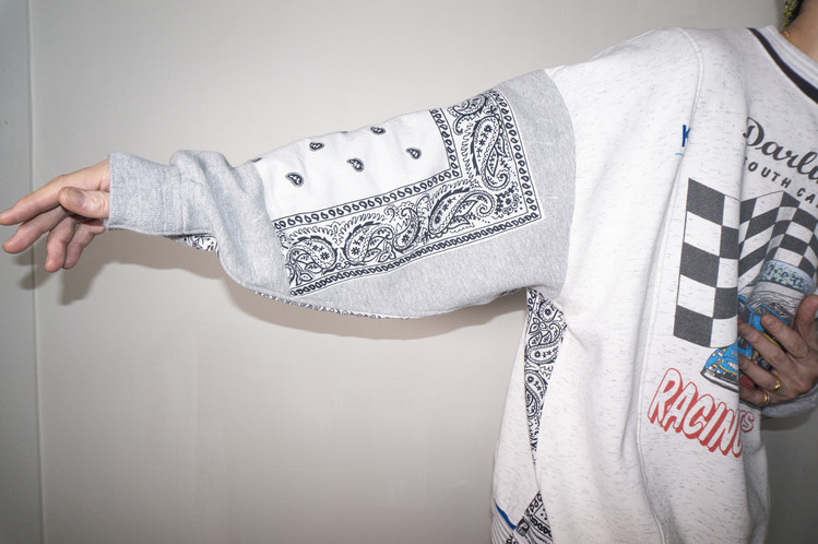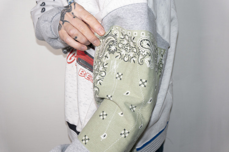 팔부분은 그레이 색상으로, 화이트와 옅은 그린 색상 Fast color 빈티지 반다나의 넓은 패치워크와 다양한 스티치들의 표현을 확인 할 수 있으며, 옷의 옆을 채워 움직임과 함께 보여질 포인트를 보여 줍니다.