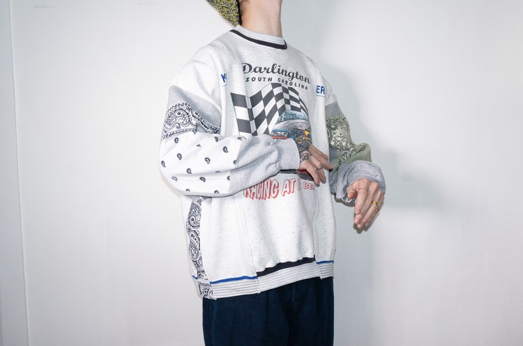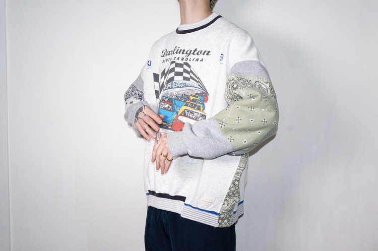 East oklm, The hand remake garments로 두장의 스웻셔츠들을 해체하고 재구성하여 반다나로 포인트를 만든 상품. 레트로한 프린팅들이 인상적인 스웻셔츠들로 구성되어 앞판의 중심과 양옆으로 조각난 프린팅을 볼 수 있습니다.