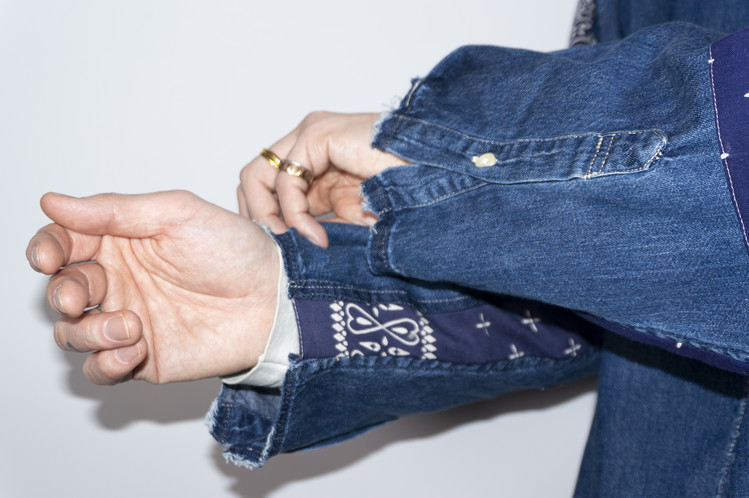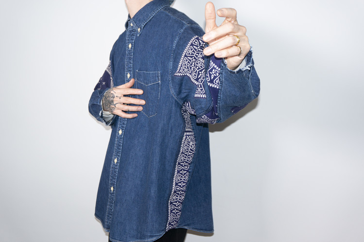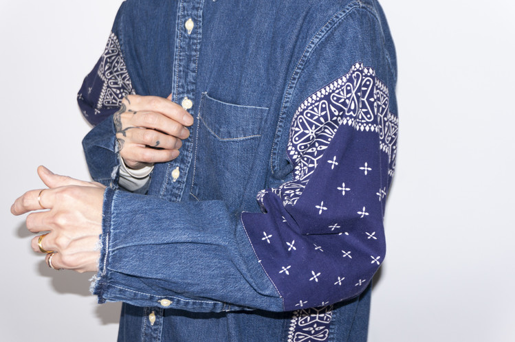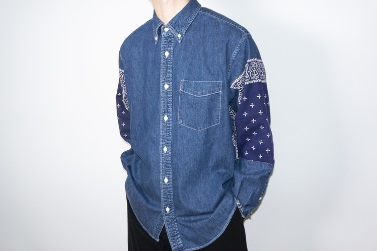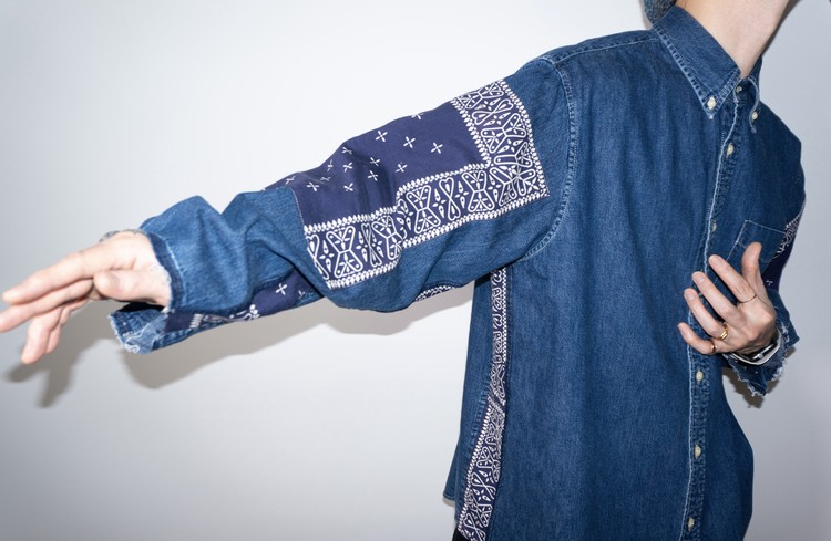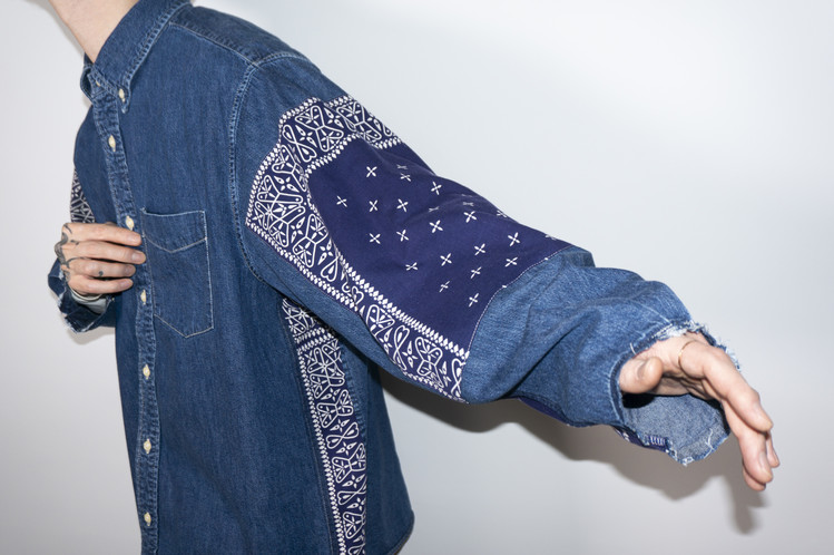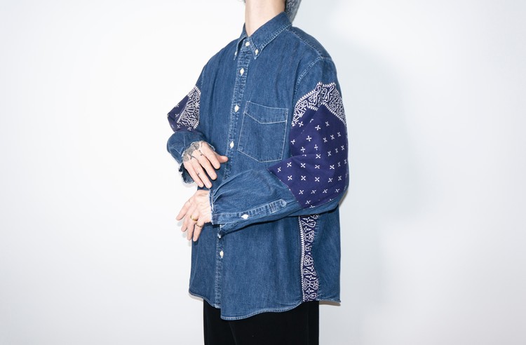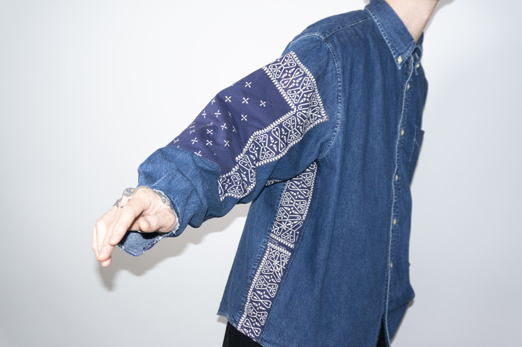 진청 데님 셔츠의 양쪽 소매에 Fast color의 반다나들로 넓게 패치워크 되어진 구성과 옆을 채운 반다나의 모양을 확인 할 수 있습니다.