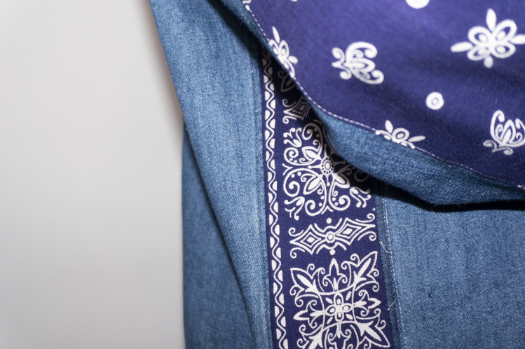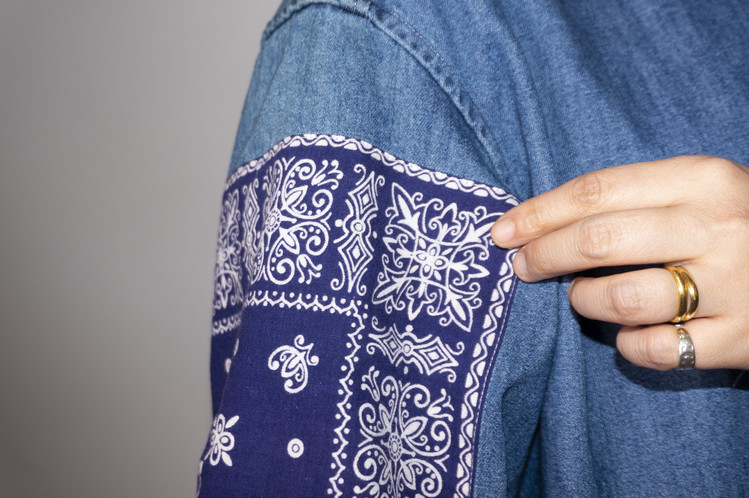 반다나들은 네이비 색상으로 데님 셔츠의 색상과 조화롭게 자리하며, 서로 다른 문양과 세월감으로 보다 좋은 표현을 가집니다.