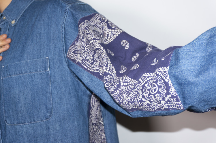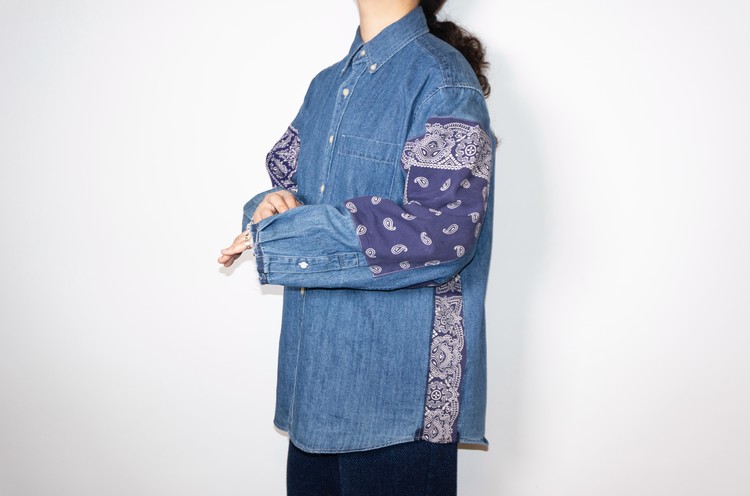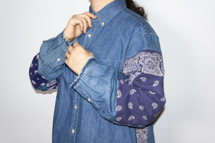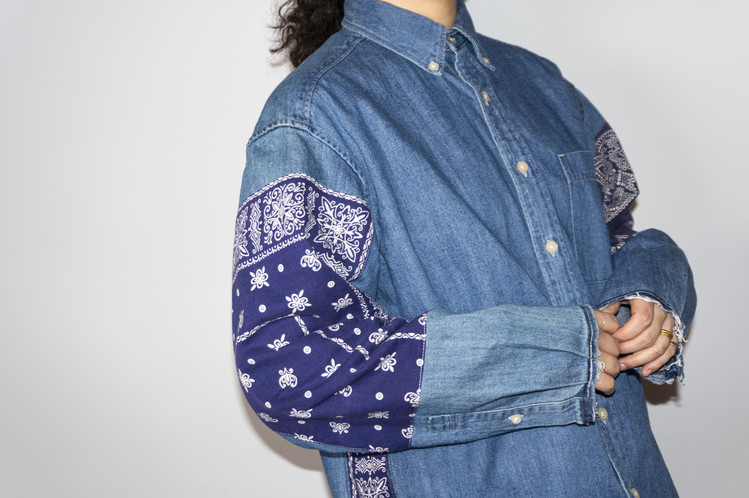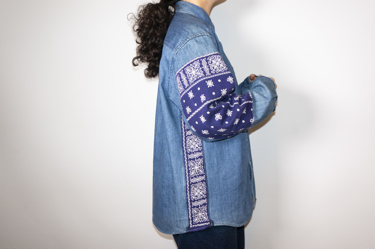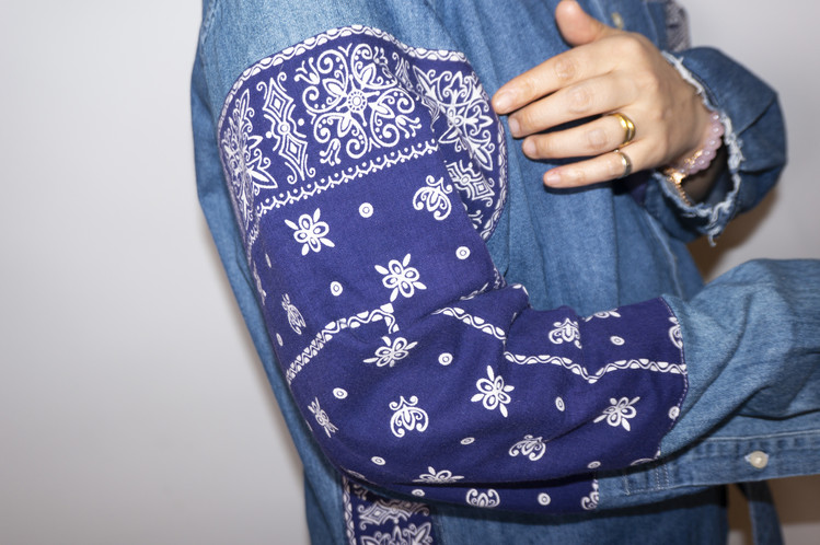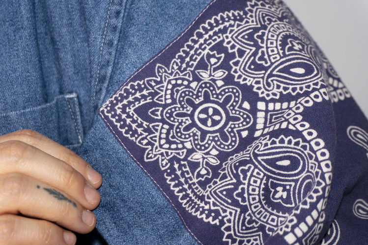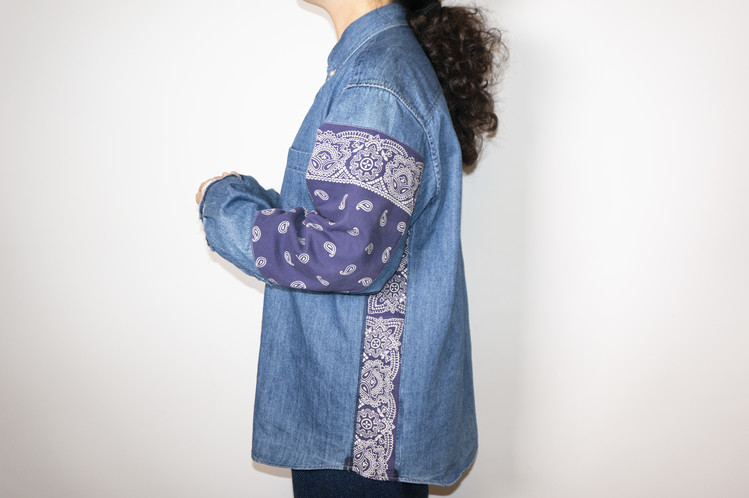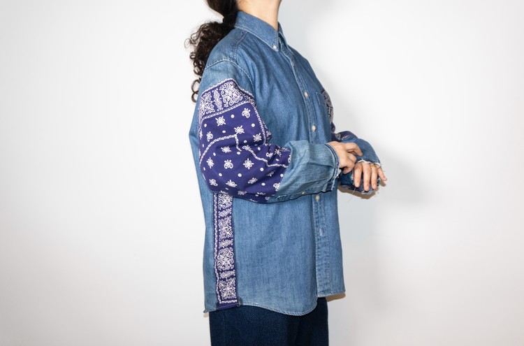 양쪽 소매에 Fast color 빈티지 반다나들로 넓게 패치워크 되어진 구성과 옆을 채운 모양을 볼 수 있습니다.