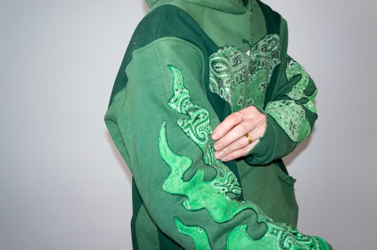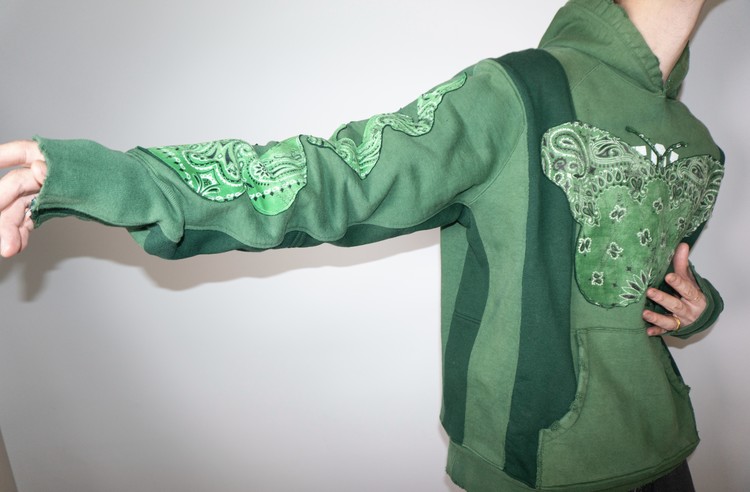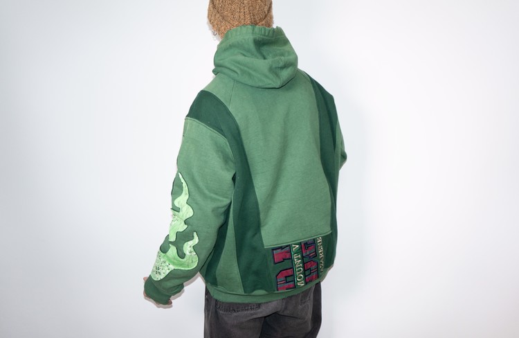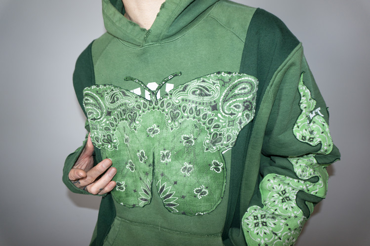 East oklm, The hand remake garments로 후디와 스웻셔츠를 해체하여 재구성하고, 나비와 불꽃 모양의 패치워크를 하여 만들어진 상품.