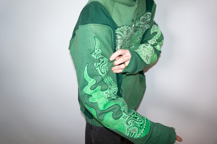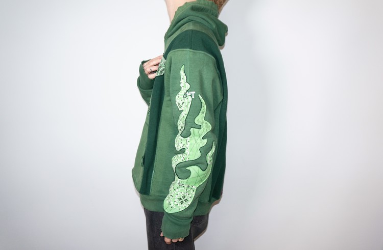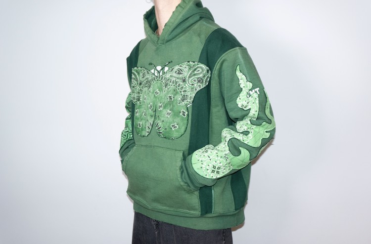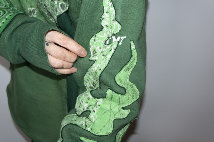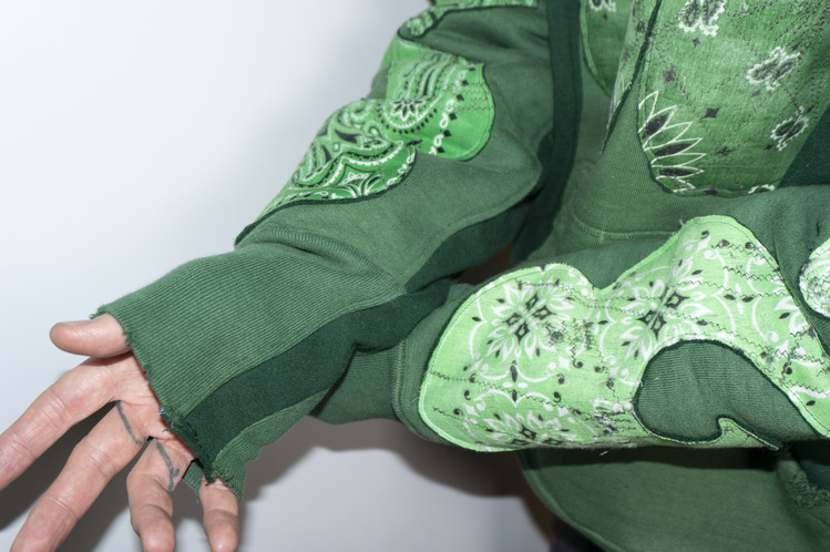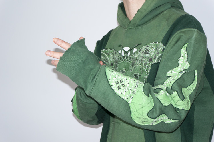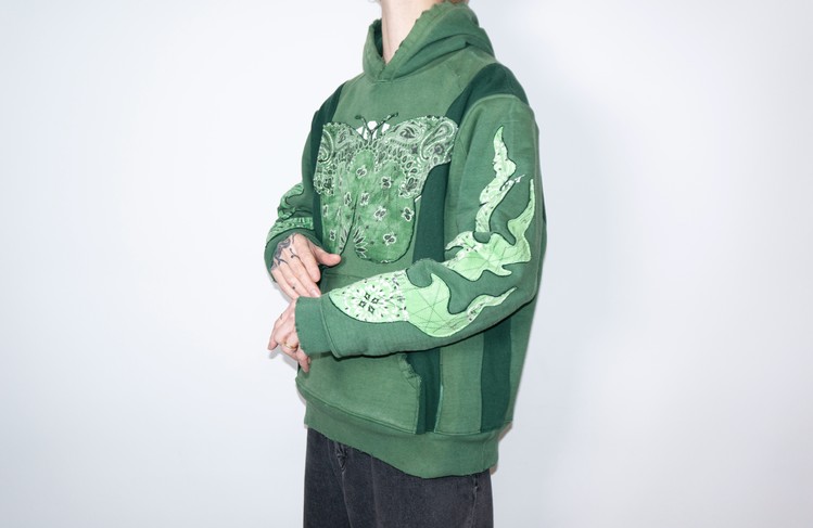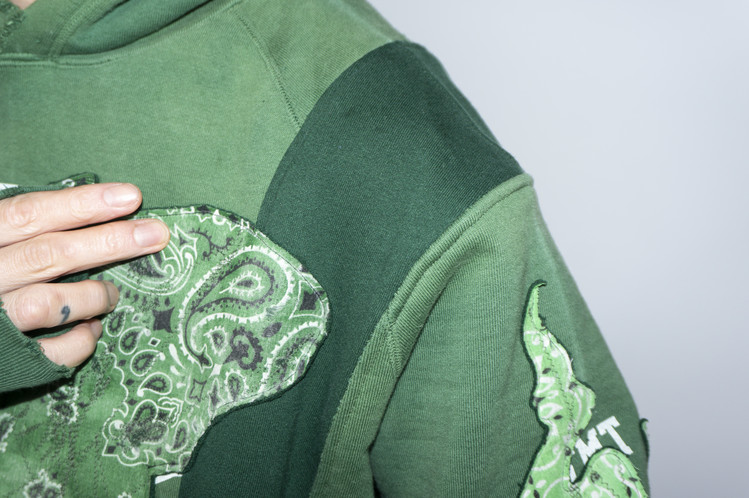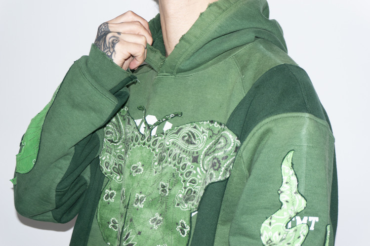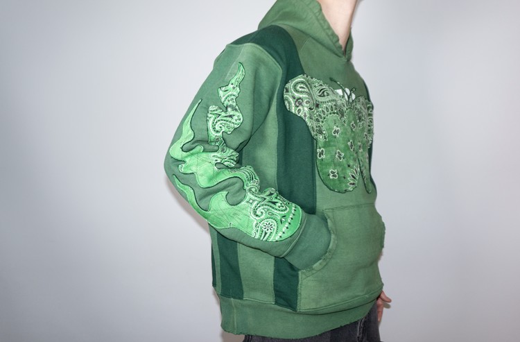 단단한 원단감을 가진 빈티지 그린 색상 후디를 중심으로 어두운 색상톤을 가진 그린 스웻셔츠를 믹스 하였으며, 스웻셔츠의 조각 위에 반다나를 접착하고 데미지 작업, 스티치 작업을 통해 패치를 표현 하였습니다.