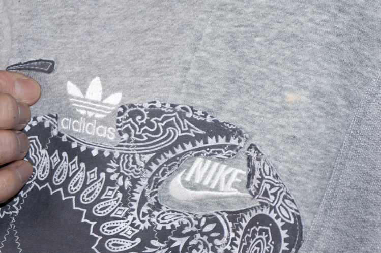 연한 그레이 색상의 Adidas 후디를 중심으로 같은 색상톤 다른 그레이 Nike 스웻셔츠와 아메리칸 빈티지 스웻셔츠 3개를 믹스 하였으며, 스웻셔츠의 조각 위에 짙은 그레이 색상으로 탈색한 반다나를 데미지, 컬러 페이드 작업 및 스티치 작업을 통해 빈티지한 표현의 패치를 볼 수 있고, 왼쪽 가슴에는 Adidas와 Nike의 로고 자수를 확인할 수 있습니다.
