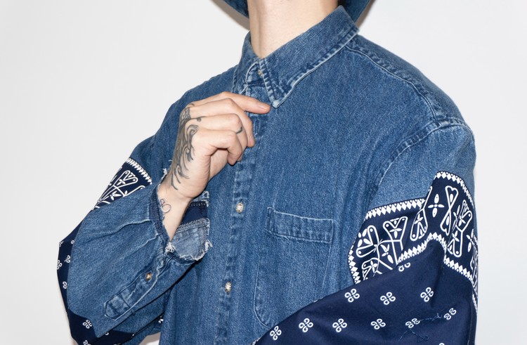 양쪽 소매에 네이비 색상의 반다나들로 넓게 패치워크 되어진 구성과 옆을 채운 모양을 볼 수 있습니다. 데님 셔츠의 색상과 반다나의 조화로운 색상의 구성을 볼 수 있으며, 양쪽 반다나의 문양을 동일하게 맞추어 좋은 균형감을 가집니다.