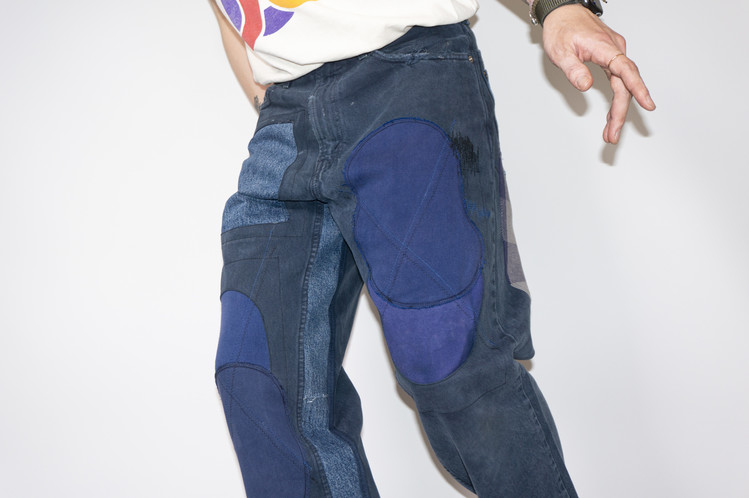 팬츠의 안심은 중청의 Levis 505의 조각과 Fast color의 빈티지 반다나로 채워 기존보다 여유로운 실루엣을 가지고, 이는 움직임과 함께 보여질 포인트로 자리하며, 뒷포켓을 겹쳐 표현하여 2개의 Levis Red tab을 볼 수 있습니다.