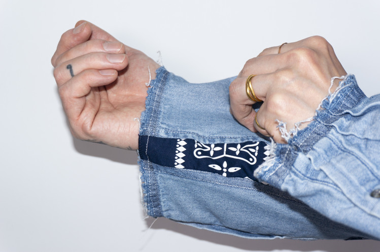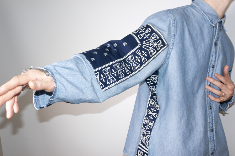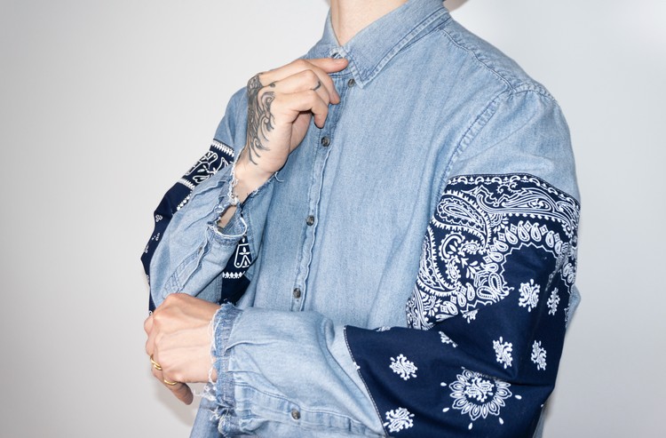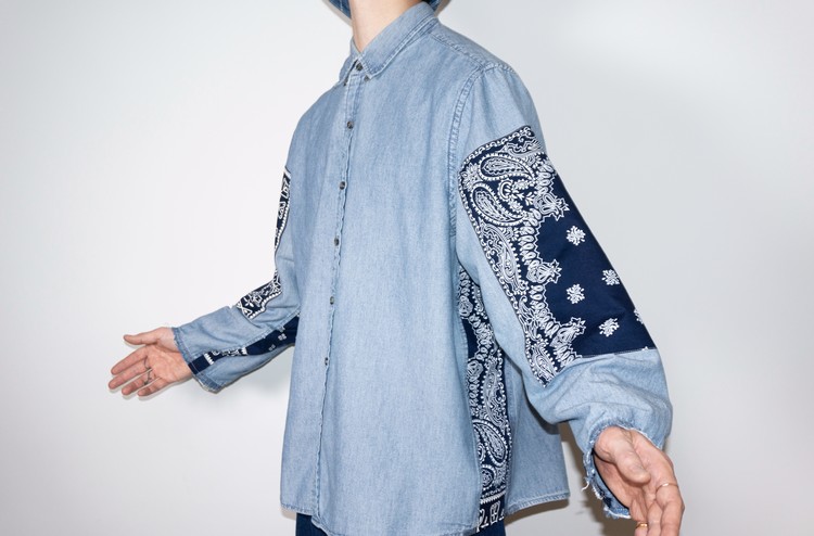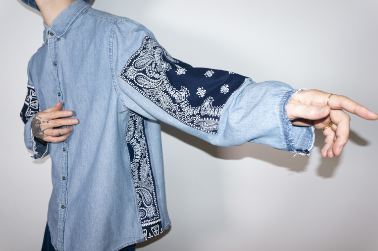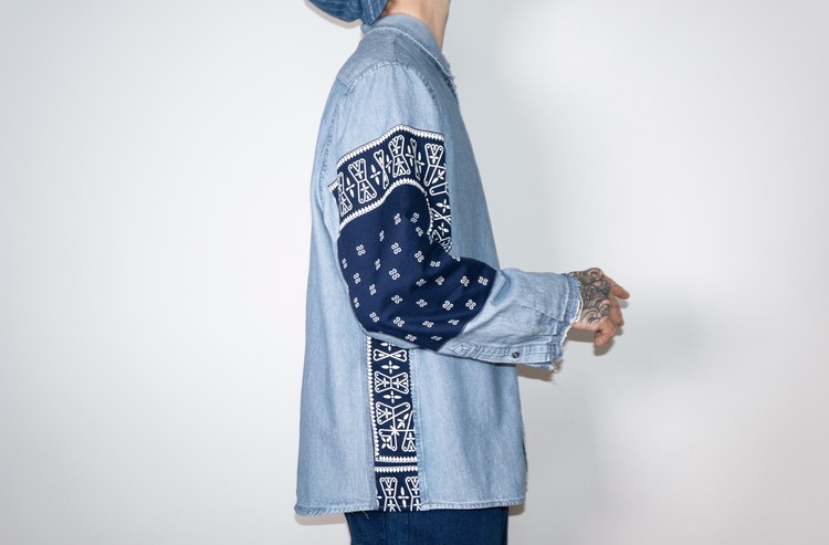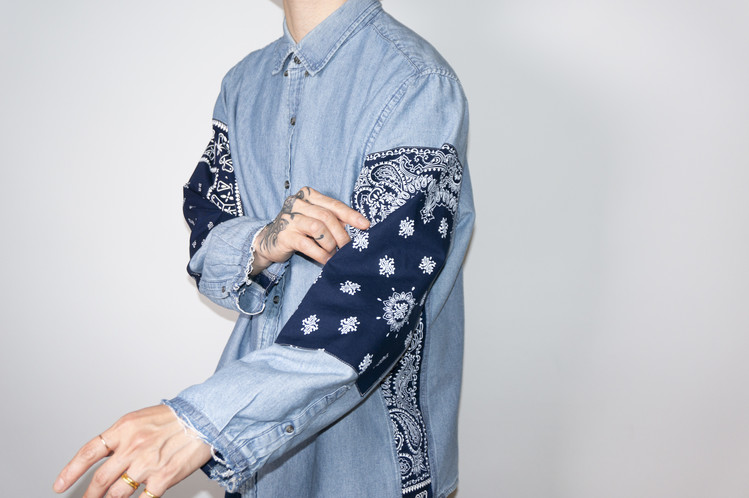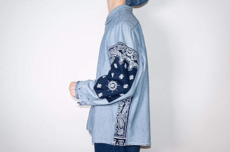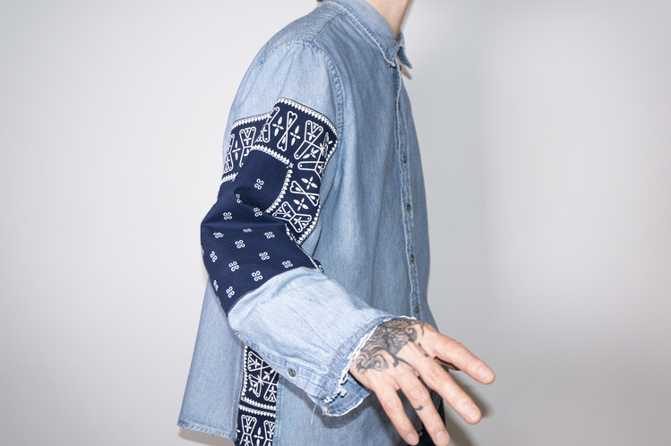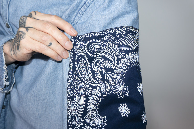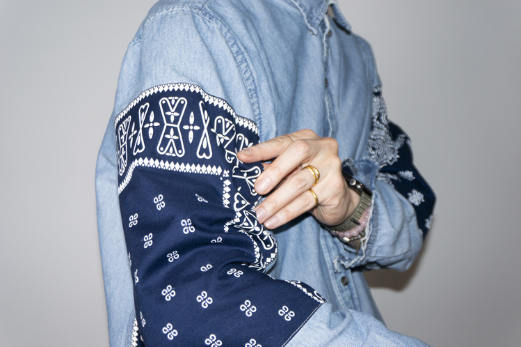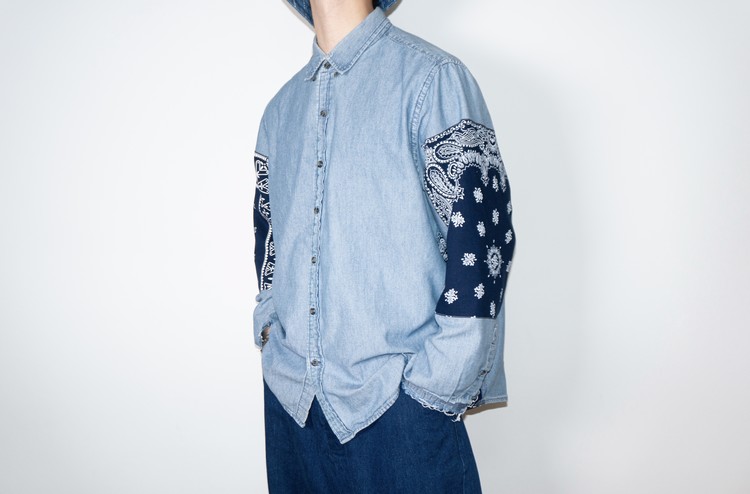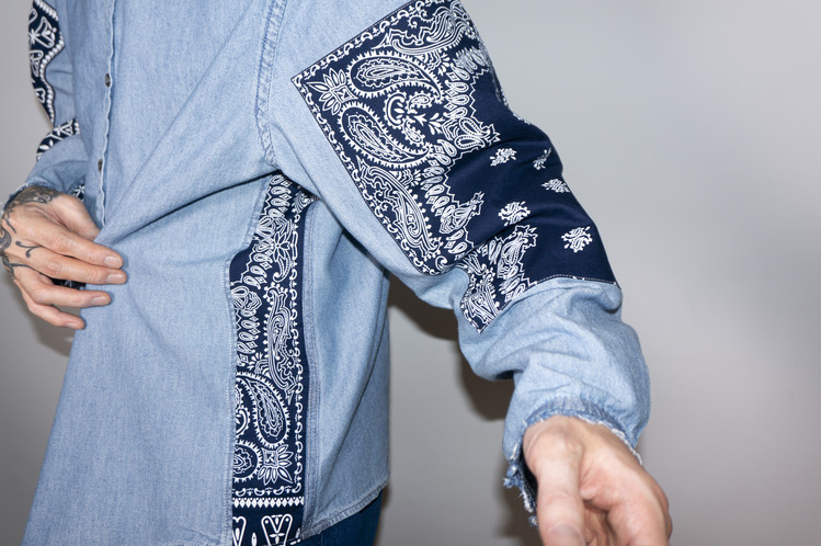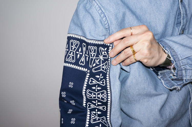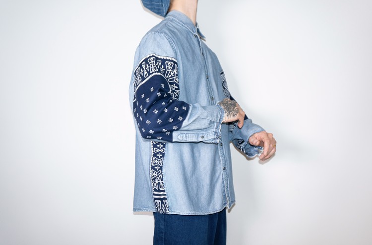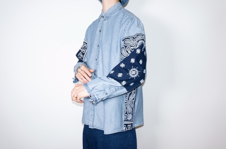 데님 셔츠의 색상과 반다나의 조화로운 색상 구성을 확인할 수 있으며, 양쪽 소매의 반다나 문양을 다르게 사용하되 색상을 통일해주어 좋은 균형감을 가집니다.