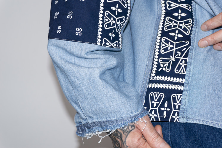 양쪽 소매에 서로 문양이 다른 네이비 색상의 반다나들로 넓게 패치워크 되어진 구성과 옆을 채운 모양을 볼 수 있습니다.