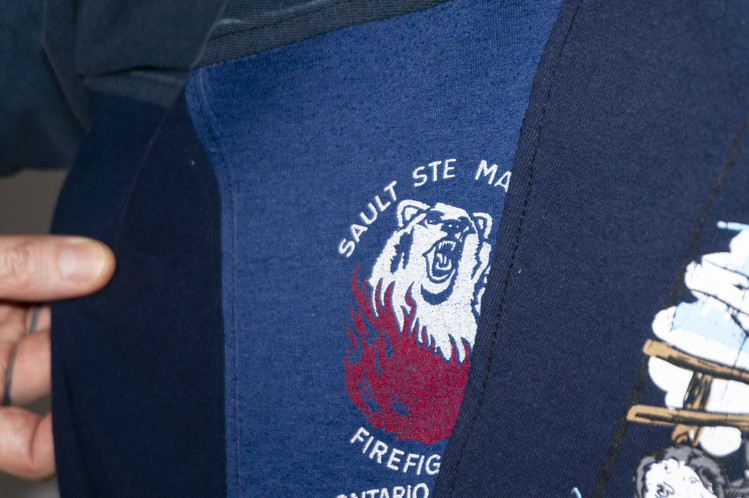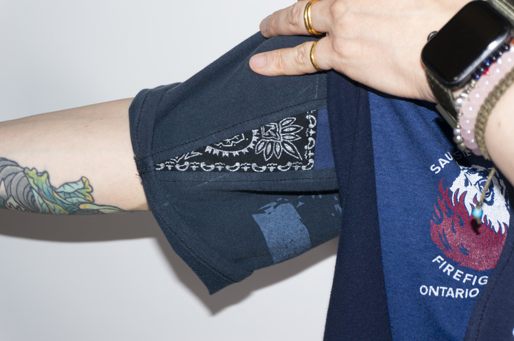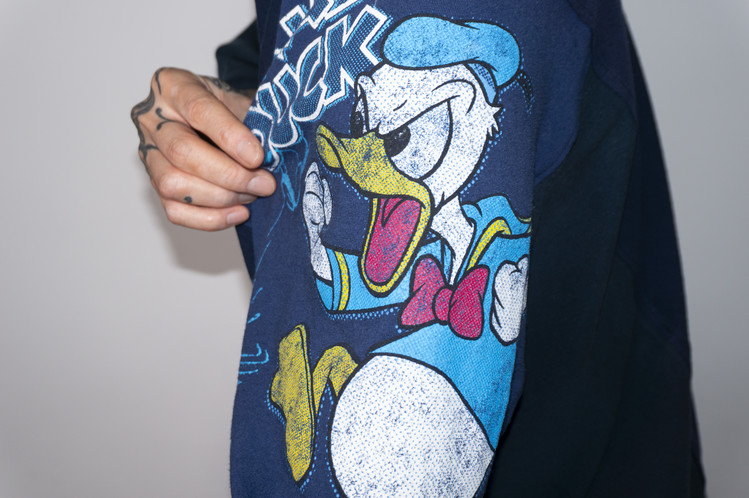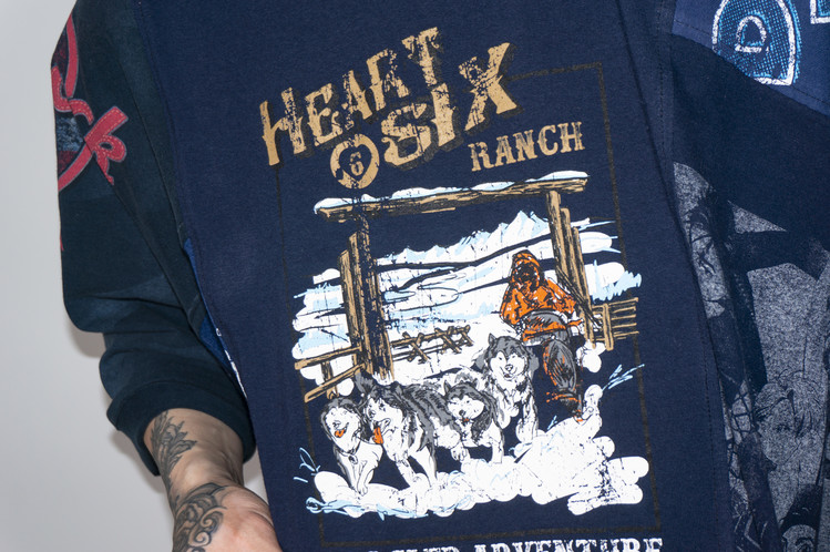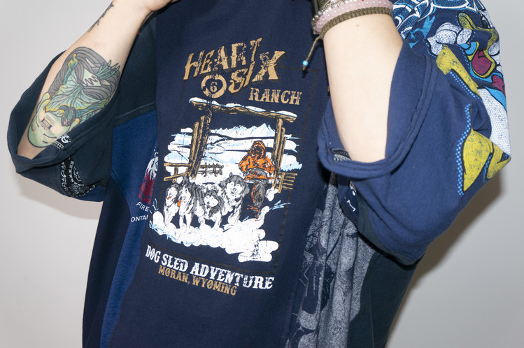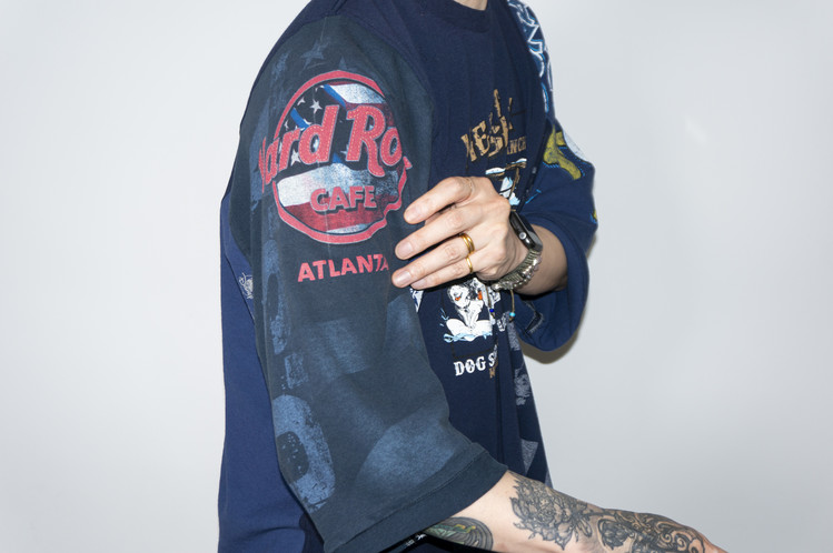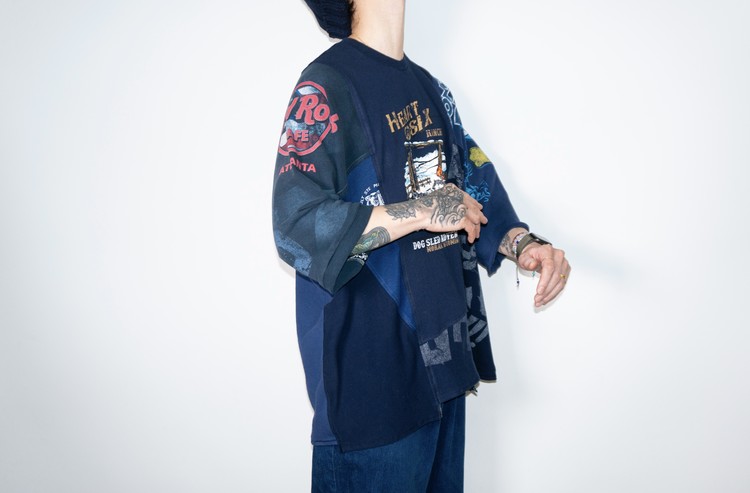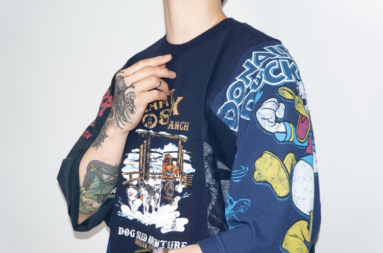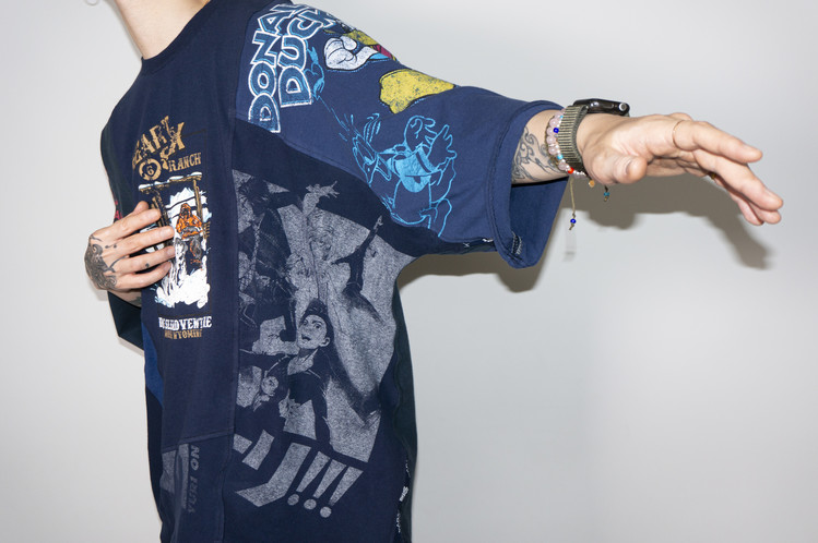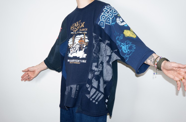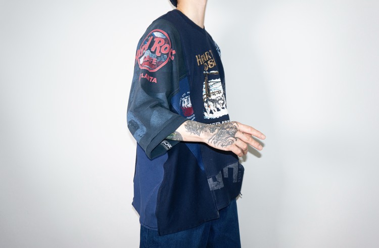 East oklm, The hand remake garments로 여러장의 티셔츠들을 해체하고 재구성하여 만들어진 믹스 티셔츠 상품.