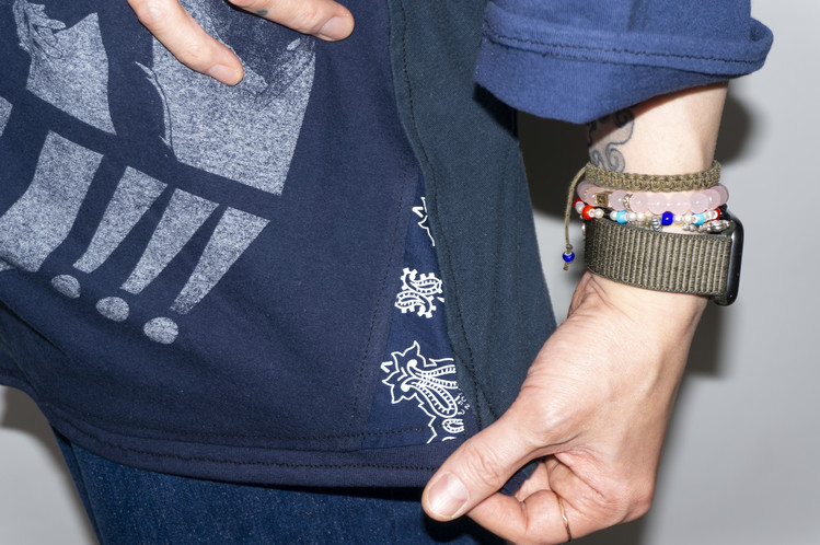 작은 포인트의 반다나 조각 포인트 또한 찾아볼 수 있고, 빈티지한 프린팅이 중심이 되는 티셔츠의 조각들과 케어라벨 프린팅 또한 좋은 포인트로 사용하였으며, 어깨선이 자유로워 보다 여유있는 실루엣으로 편안하게 입을 수 있는 완성도 높은 하나의 옷 입니다.