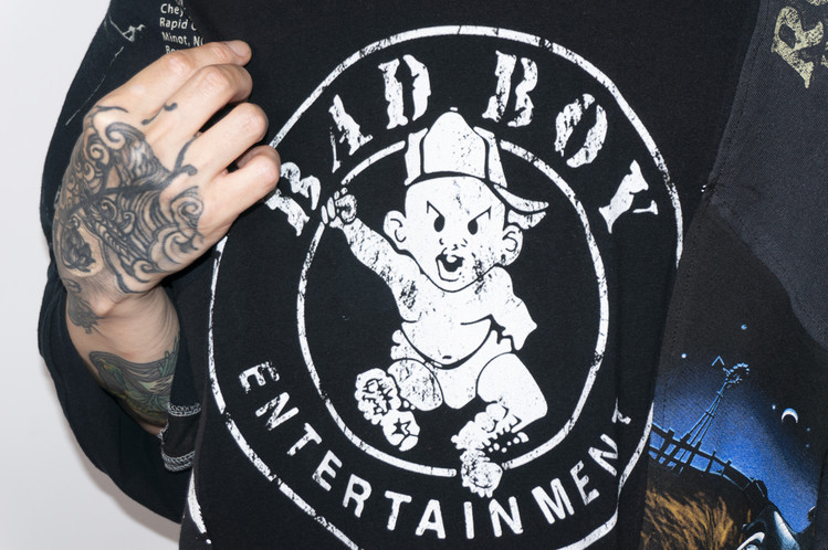 레트로한 프린팅이 인상적인 블랙 색상의 아메리칸 빈티지 티셔츠들의 조각으로 구성된 모습을 볼 수 있으며, 반다나의 조각이 패치워크 된 부분 또한 확인할 수 있습니다.