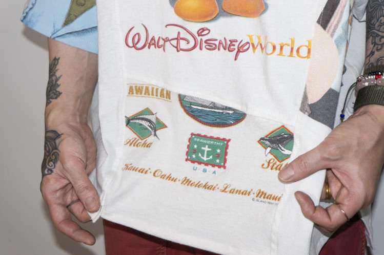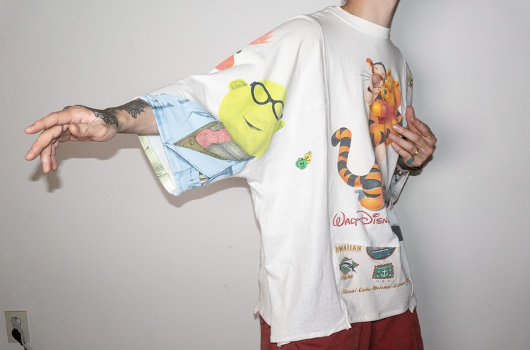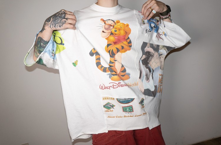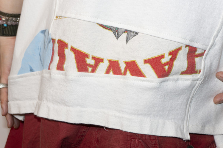 East oklm, The hand remake garments로 여러장의 티셔츠들을 해체하고 재구성하여 만들어진 믹스 티셔츠 상품.