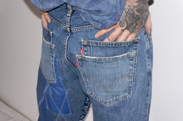 뒷주머니는 다른 Levis 리바이스 데님 팬츠에서 발췌하여 겹쳐 만들어 두개의 Levis Red Tab을 볼 수 있고, 팬츠의 안심은 데님 팬츠의 뒷면과 앞면, 그리고 데미지 및 컬러 페이드 작업을 한 반다나로 만들어 움직임과 함께 보여질 포인트이자 여유로운 실루엣을 표현하도록 완성 되었습니다.