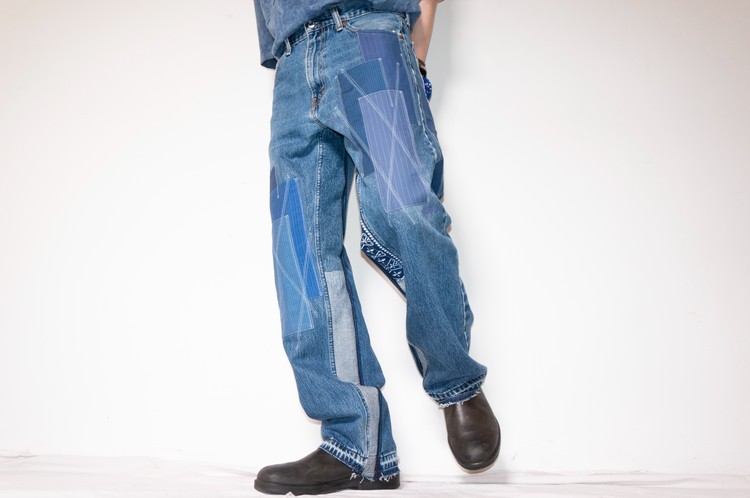 매력적인 중청 데님 색상의 Levis 505 데님 팬츠와 조화롭게 어울릴 수 있는 블루 계열의 테일러 원단들로 패치워크 되어 졌으며, 불규칙하나 정돈된 느낌으로 안정감있는 구성을 볼 수 있습니다.