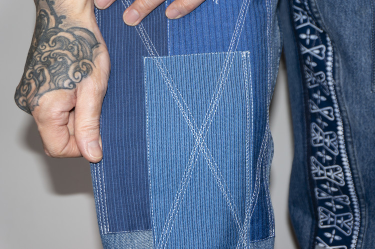 East oklm, The hand remake denim으로 Levis 505 팬츠를 이용하여 테일러 원단으로 패치워크 하고, 팬츠의 안심을 데님 뒷면으로 채워 만들어진 상품.