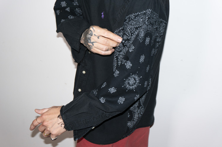 양쪽 소매에 블랙 색상의 반다나들로 넓게 패치워크 되어진 구성과 옆을 채운 모양을 볼 수 있으며, 반다나 문양이 은은하게 보일 수 있도록 옅은 표현의 부분을 사용하였습니다.