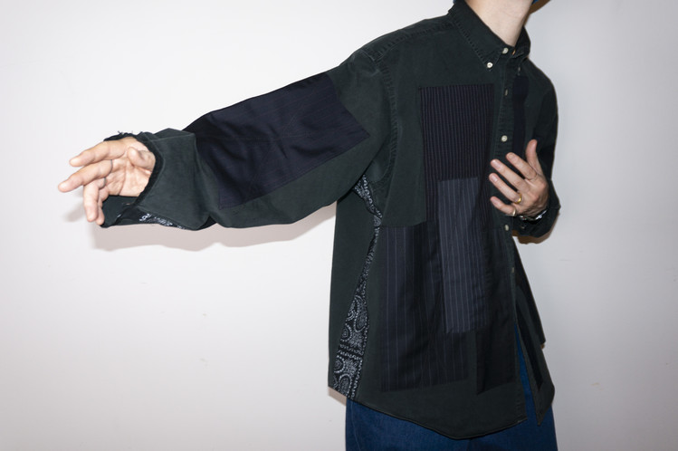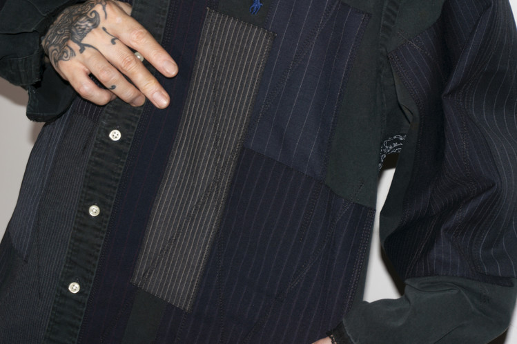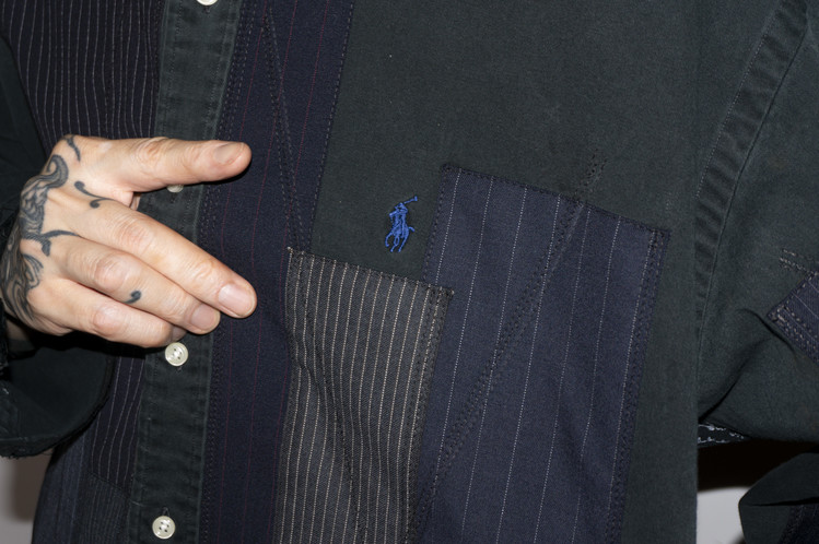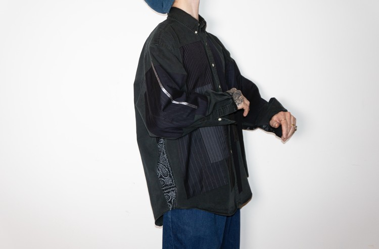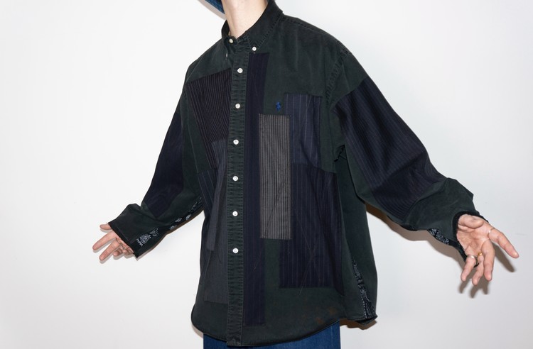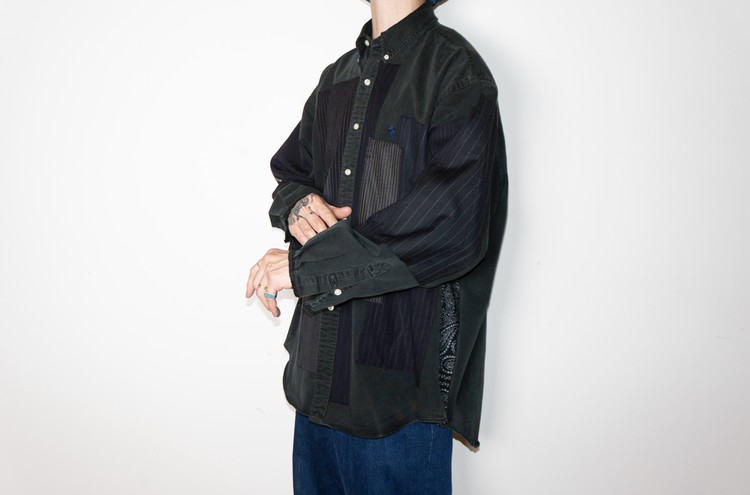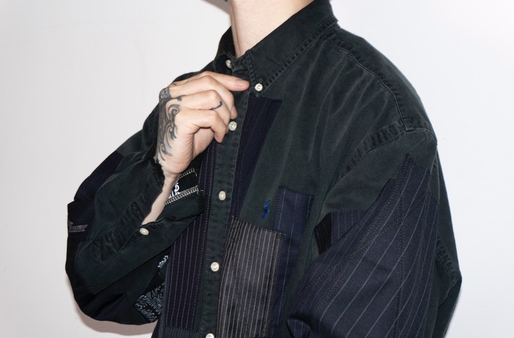 East oklm, The hand remake garments로 빈티지한 블랙 색상이 인상적인 Polo Ralph Lauren 셔츠에 테일러 원단을 패치워크하고, 반다나로 옆을 채운 셔츠 상품.