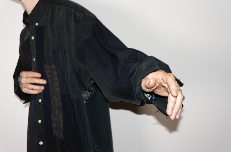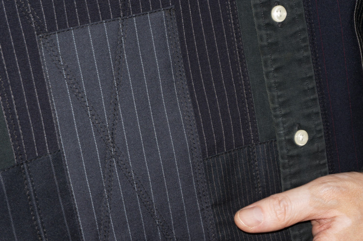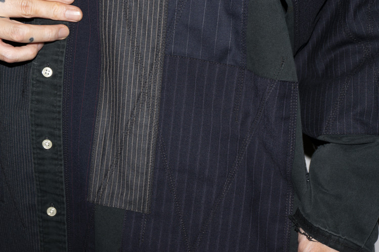 주로 블랙 색상의 테일러 원단들을 이용하여 불규칙하나 정돈된 형태의 조화로운 패치워크를 확인 할 수 있으며, 오른쪽 소매에는 테일러 원단의 혼용률과 출처가 나와 있는 리미지 파트를 사용하여 보다 좋은 포인트를 주었습니다.