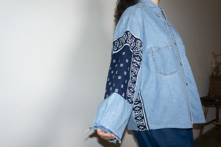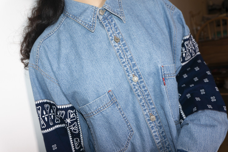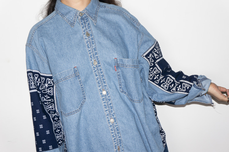 중청과 연청 사이 색상 Levis 데님 셔츠의 양쪽 소매에 네이비 색상의 East oklm, Indigo blue bomb 반다나를 이용하여 양쪽 소매에 넓게 패치워크 되어진 구성과 옆을 채운 모양을 볼 수 있습니다.