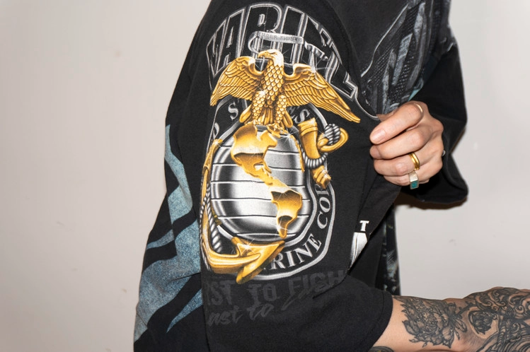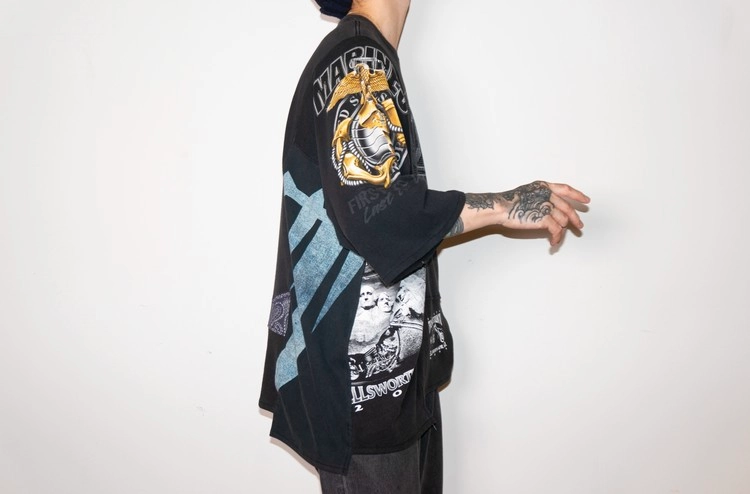 East oklm, The hand remake garments, mixed T-shirt (ACDC x U.S.Marine, Black)SOLDOUT