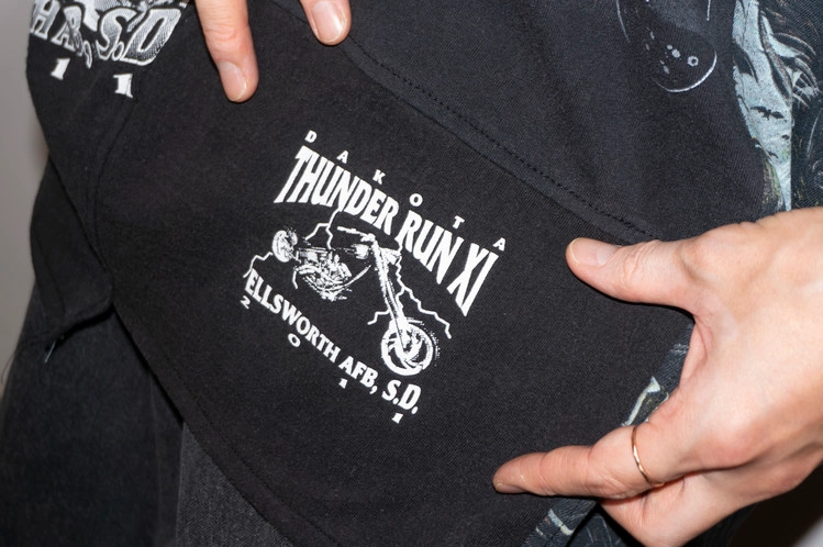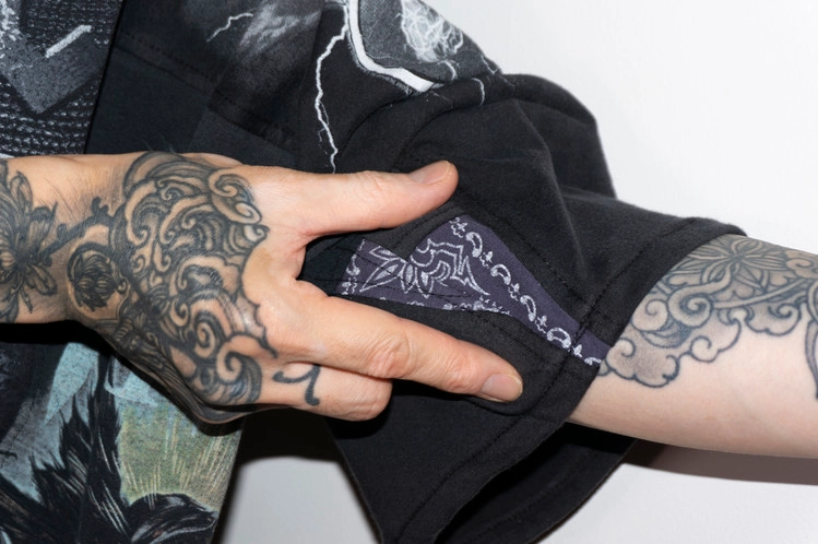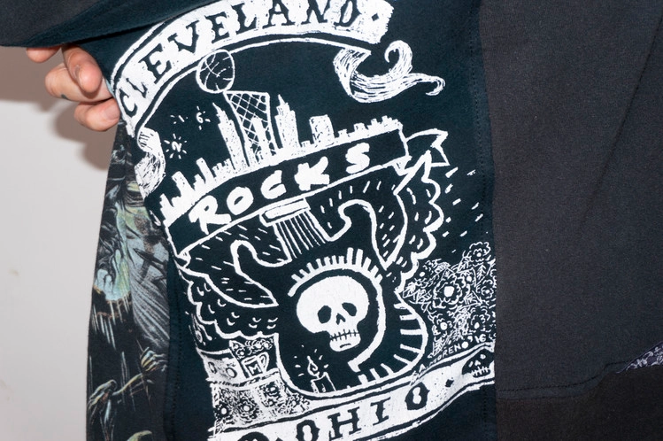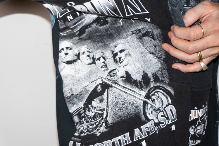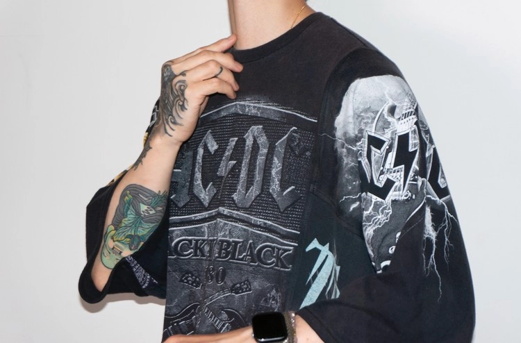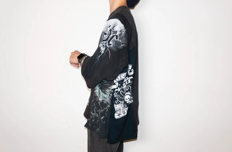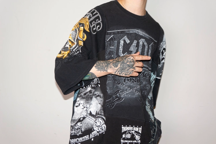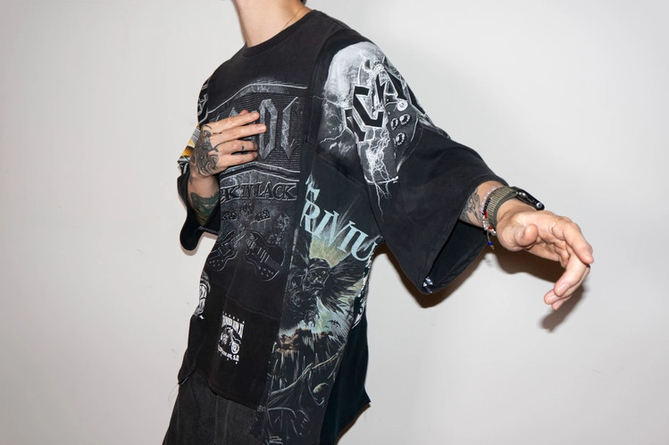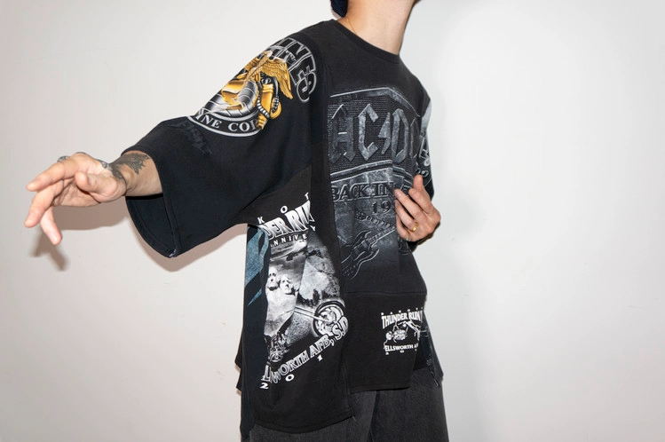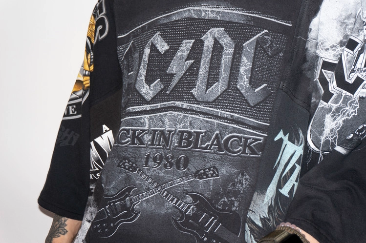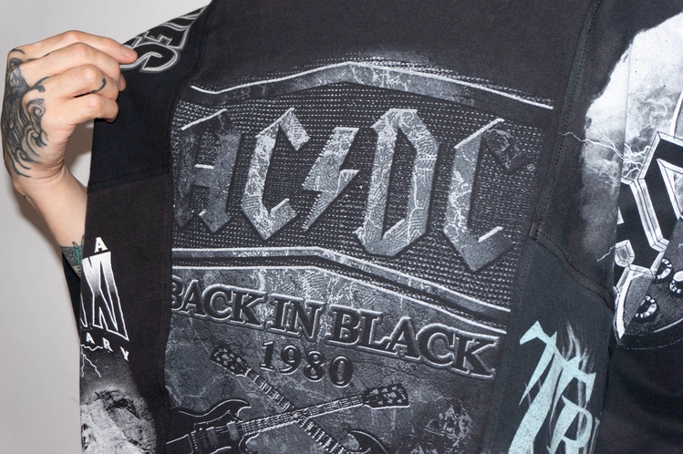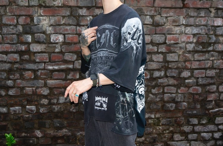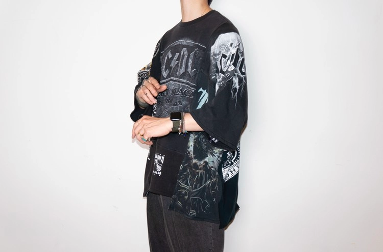 서로 세월감이 달라 적절한 색상톤 차이를 보이는 블랙 색상의 티셔츠들로 구성 되었으며, ACDC 프린팅의 티셔츠를 중심으로 U.S. Marine, ACDC, 레트로한 프린팅의 조각들이 연결된 구성을 볼 수 있습니다.