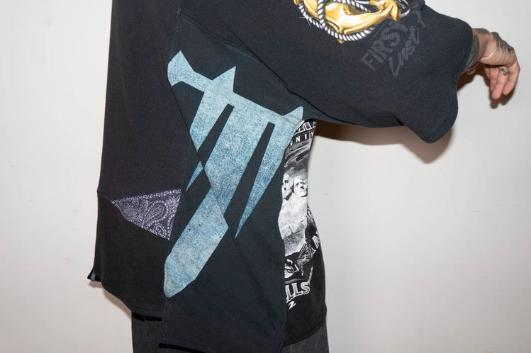 East oklm, The hand remake garments로 여러장의 아메리칸 빈티지 티셔츠들을 해체하고 재구성하여 만들어진 믹스 티셔츠 상품.