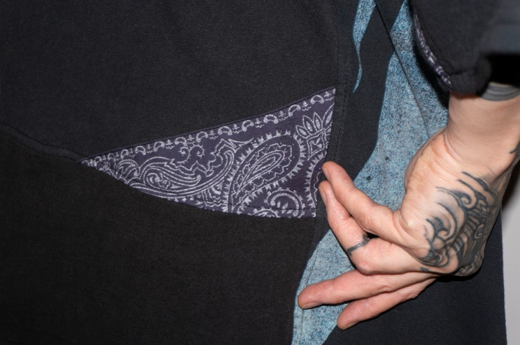 패치워크에 사용된 반다나는 탈색 작업을 진행한 컬러감으로 조화롭게 표현 되었으며, 곳곳에 배치되어 좋은 포인트를 보여 줍니다.