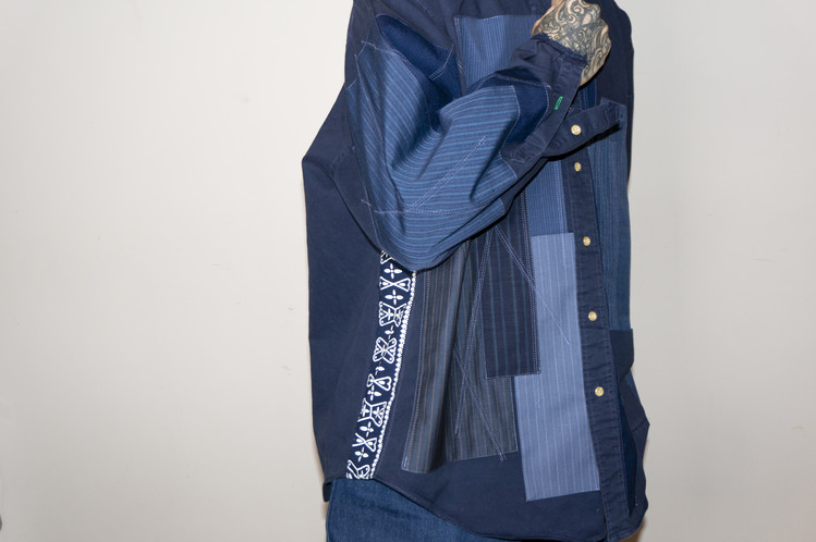 주로 네이비, 블루 계열 색상의 테일러 원단들을 이용하여 불규칙하나 정돈된 형태의 조화로운 패치워크를 확인 할 수 있으며, 오묘한 블루 컬러의 실을 사용하여 스티치들이 은은하게 강조 될 수 있도록 하였습니다.