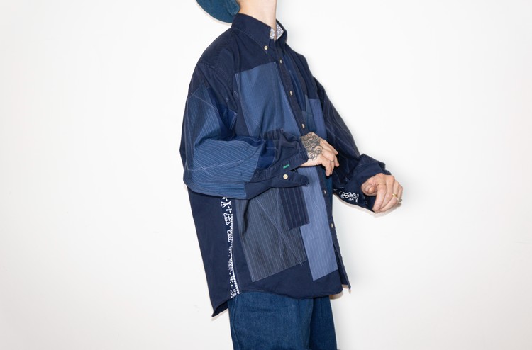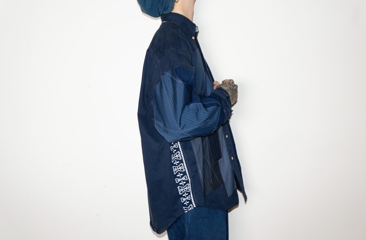 East oklm, The hand remake garments로 네이비 색상의 Tommy Hilfiger 셔츠에 테일러 원단을 패치워크하고 반다나로 옆을 채운 셔츠 상품.