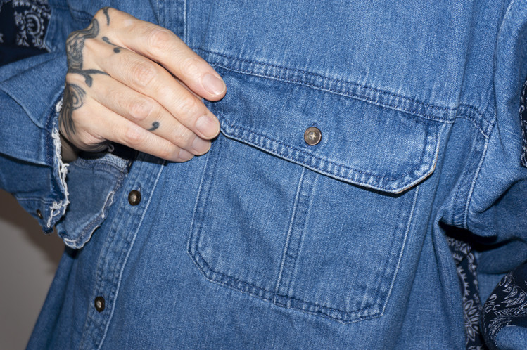 데님 셔츠와 반다나의 조화로운 색상과 문양의 구성을 확인할 수 있으며, 옆을 채운 반다나는 움직임과 함께 보여질 포인트이자 여유로운 실루엣의 표현을 더해줍니다.