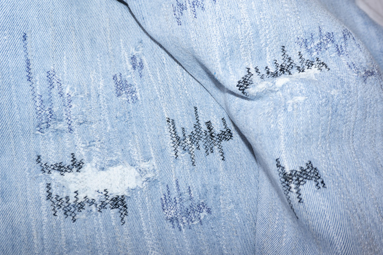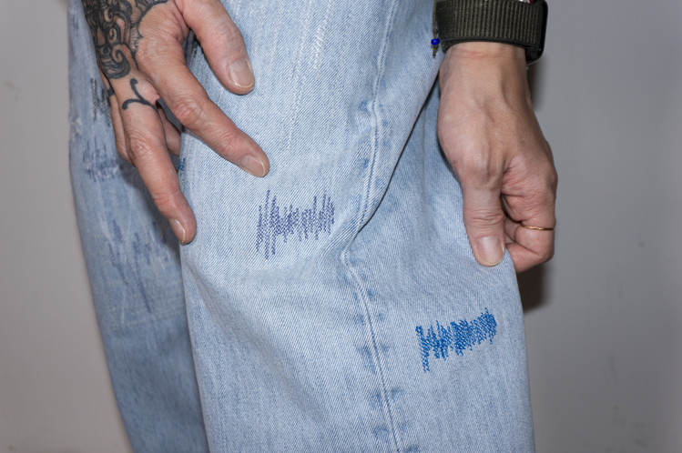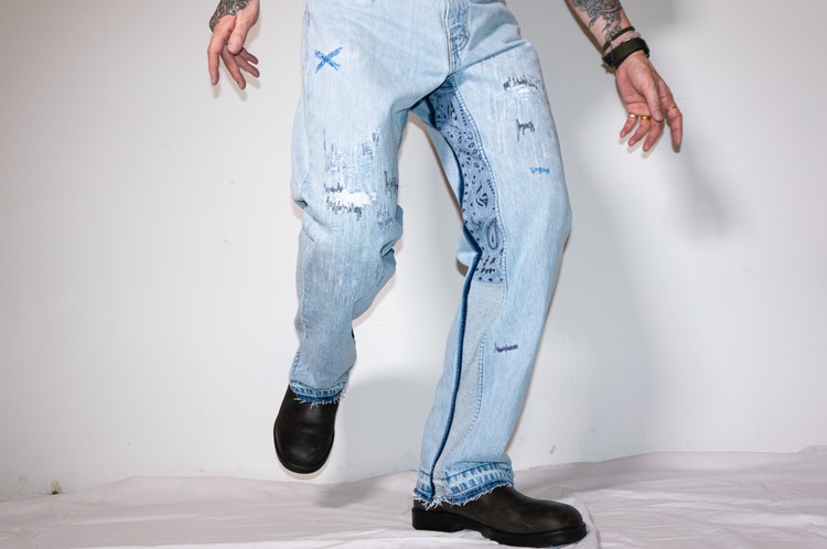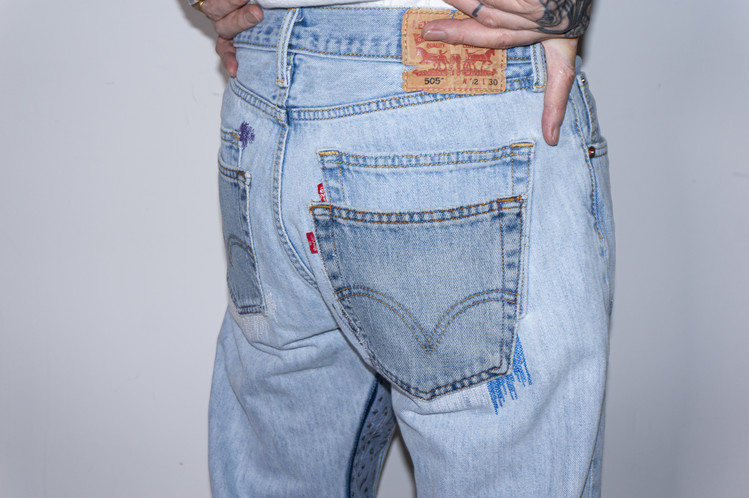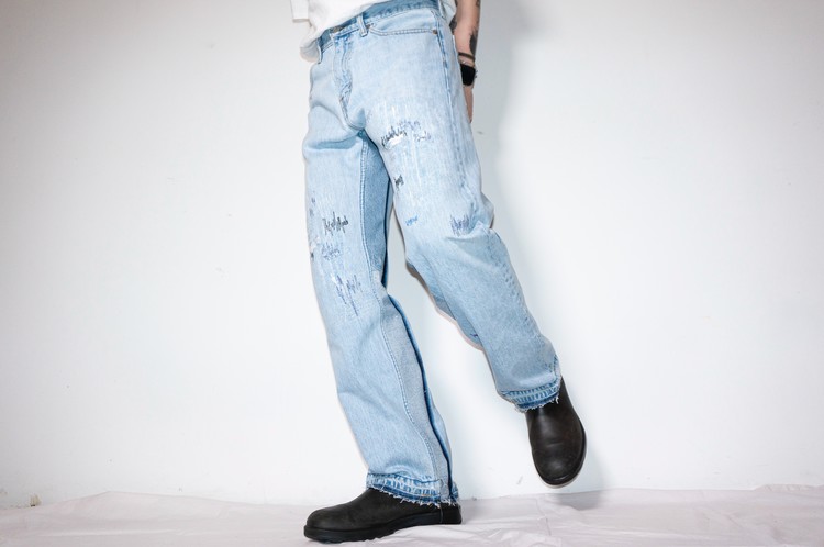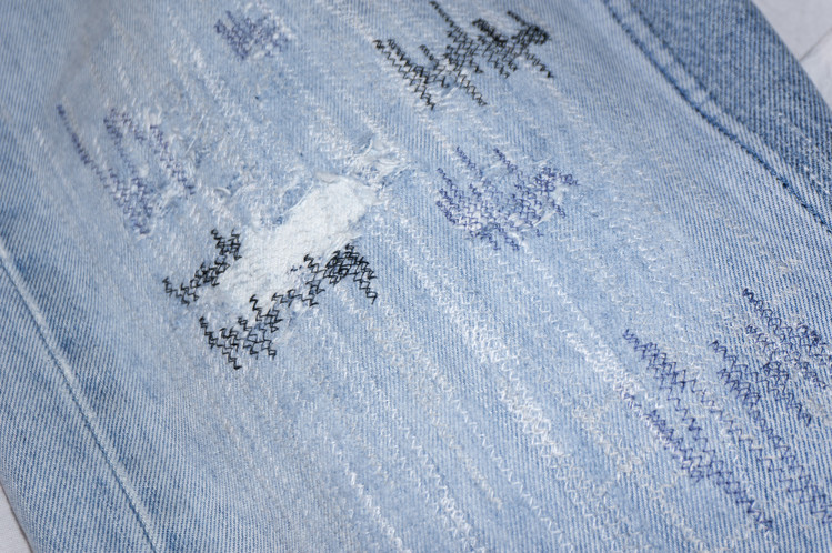 무릎부분의 안쪽에 흰색 Levis 데님 팬츠의 조각을 덧대고, 의도된 데미지 작업을 하여 빈티지한 느낌을 표현하고, 그레이 스카이 블루 색상의 실과 흰색, 검은색, 블루, 보라색 등의 실을 사용한 불규칙적인 지그재그 스티치를 볼 수 있습니다.